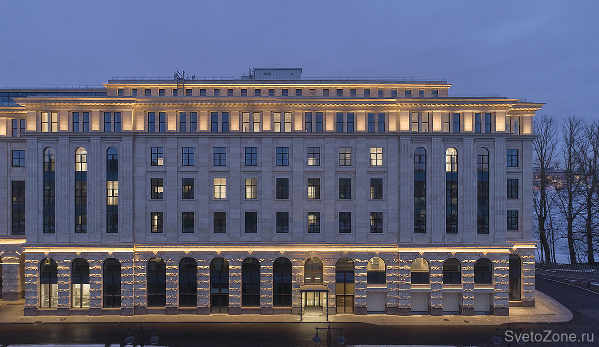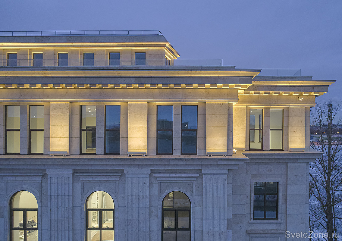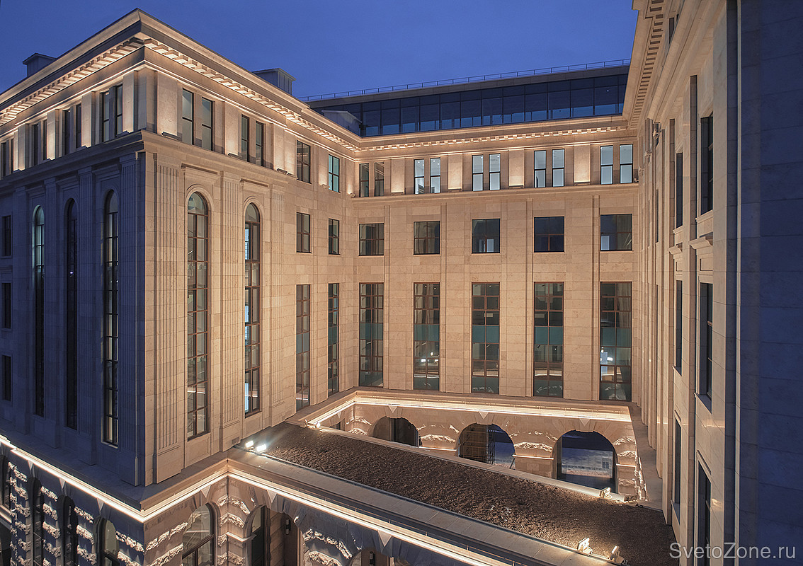 Архитектура объекта и его расположение в исторической части города подвели световых дизайнеров INTILED к выбору одной температуры свечения для всех приборов – 3000К. Для освещения первого этажа с грунта были использованы светильники серии IntiGROUND, обеспечивающие равномерный световой эффект без ожогов. Скользящее заливающее освещение 1-3 и 6-7 этажей создали световые приборы IntiLINE. Также светильниками IntiLINE были выделены отдельные элементы здания: карнизы и барельефы. Основную часть резиденции освещают прожекторы серии IntiSTARK, размещенные на опорах, а входная группа и русты оконных проемов подчеркнуты светильниками IntiGROUND-midi. |