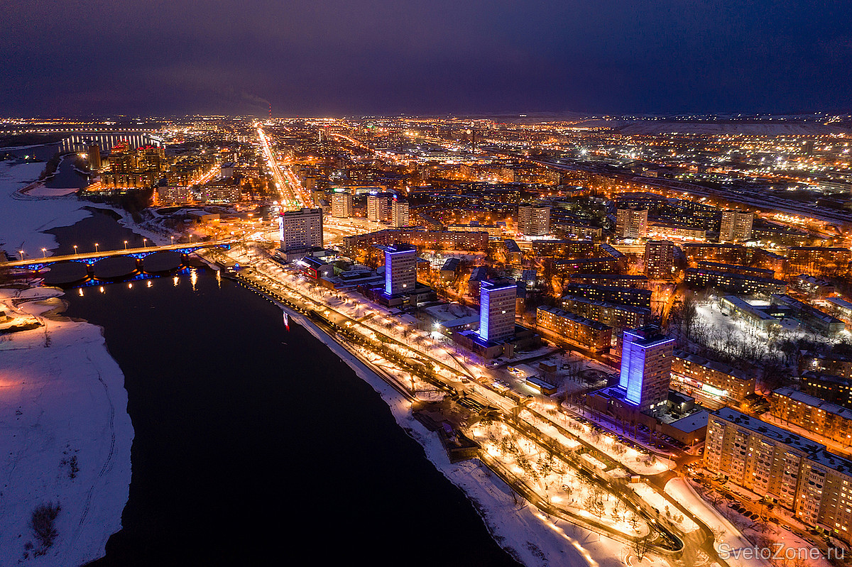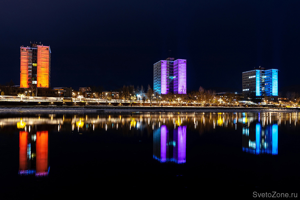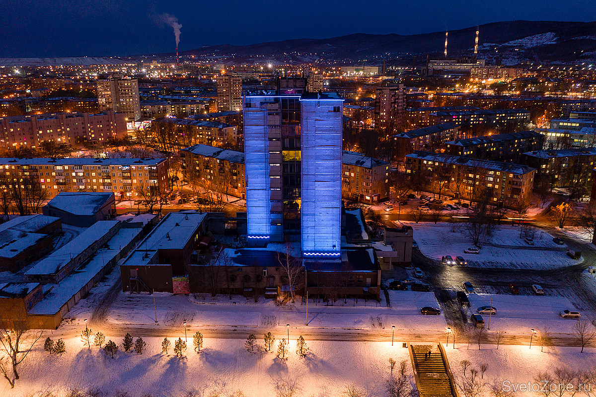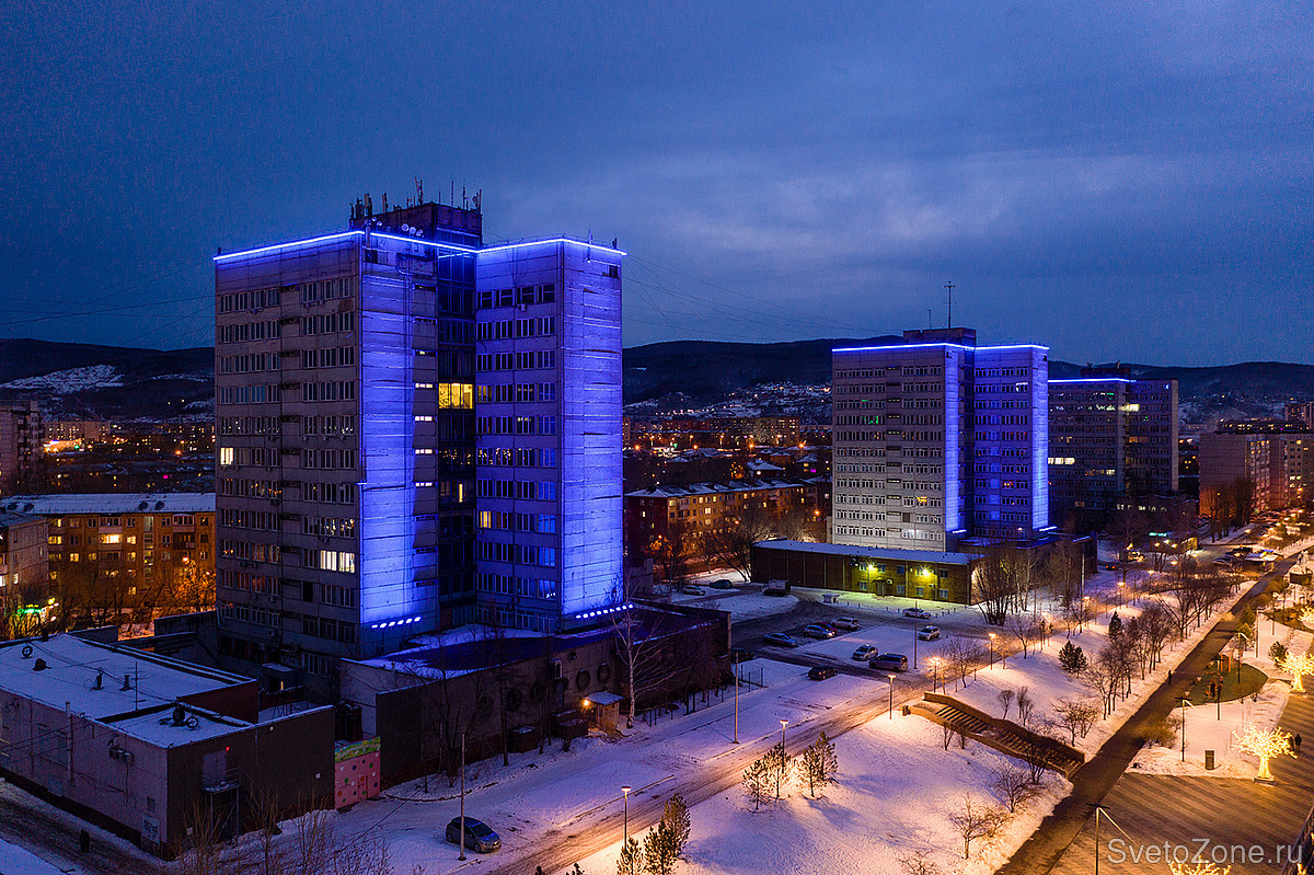 В проекте использовано более 300 световых приборов INTILED. Контур здания формируют светильники серии IntiTUBE, а равномерное заливающее освещение — прожекторы IntiSTARK с узкой оптикой. Учитывая географическую особенность объекта, все светильники выполнены в модернизации ARCTIC, которая выдерживает суровые климатические условия: экстремально низкие температуры и высокую влажность. |