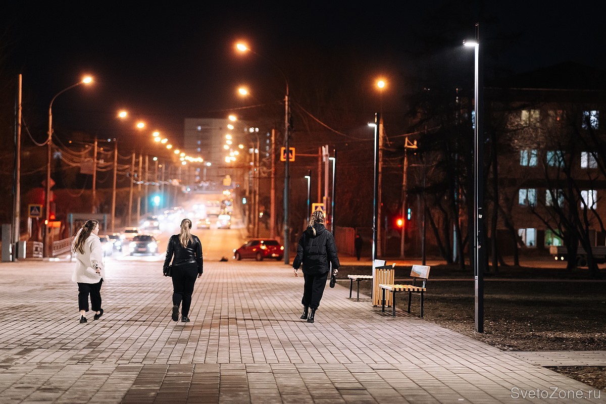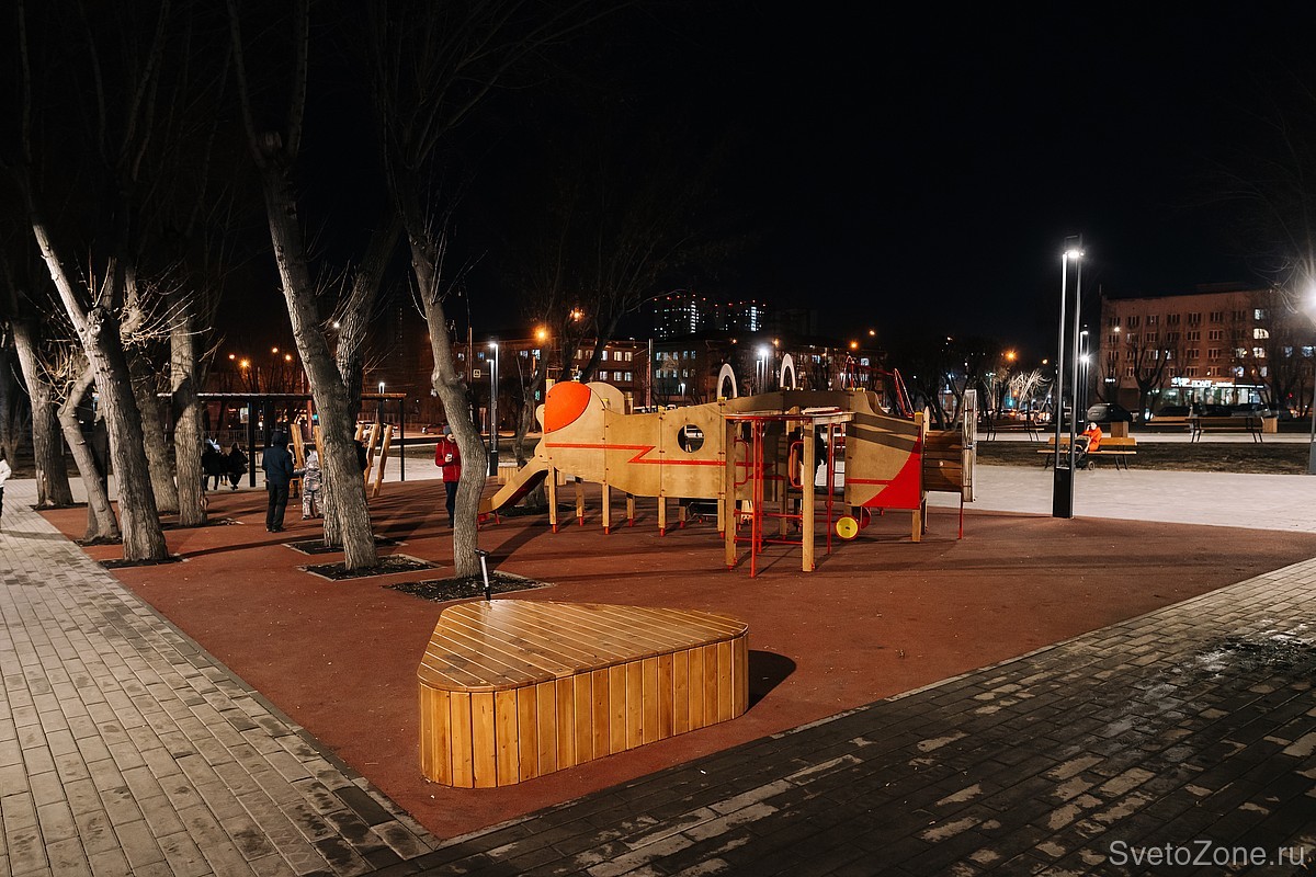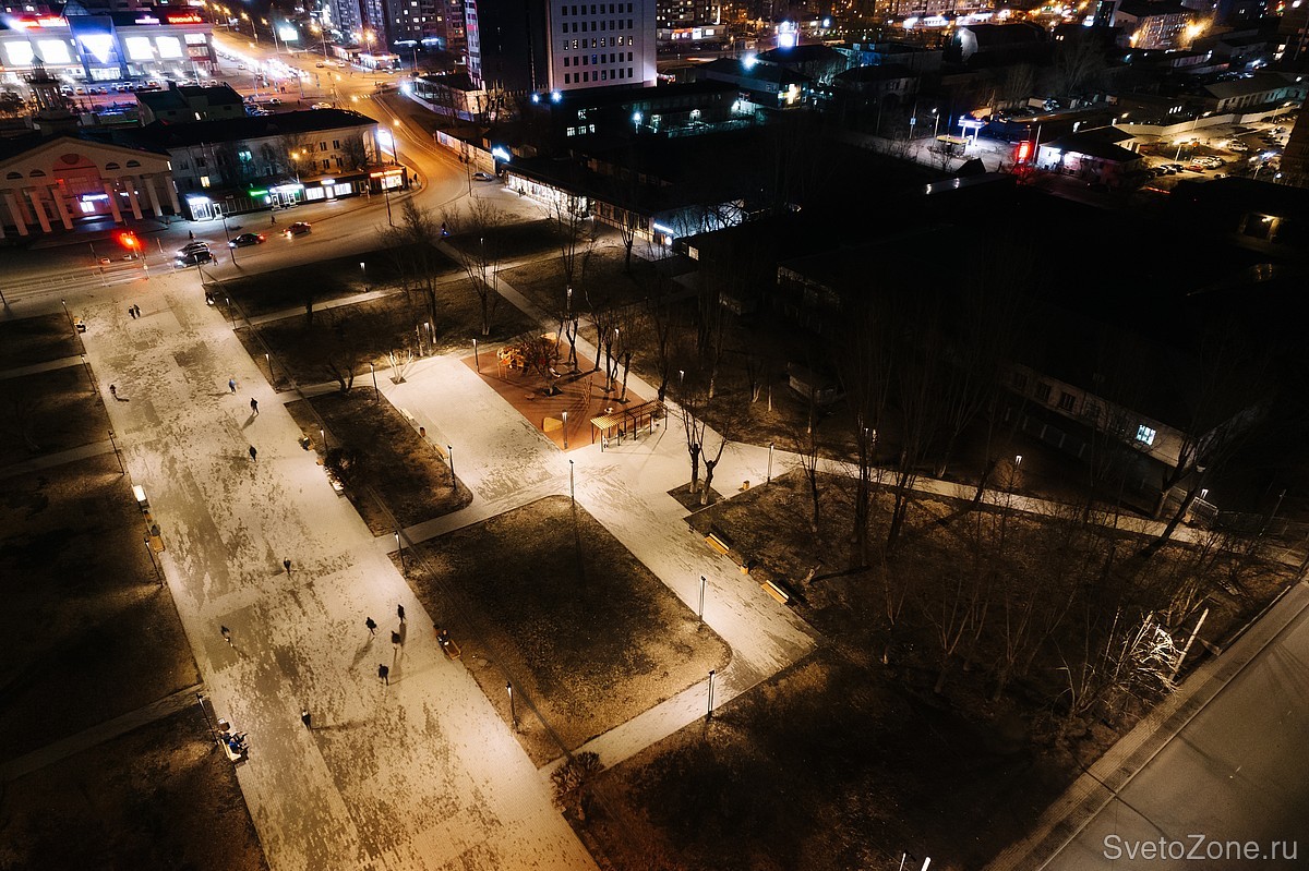 Даже в вечернее время, вблизи городско автовокзала проходит большой поток людей и автомобилей. Наши уличные светильники создают комфортные и безопасные условия для людей в этом сквере. А также играют свою роль в формировании облика общественного пространства.