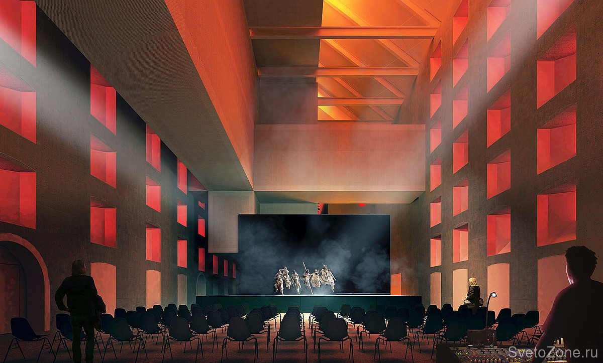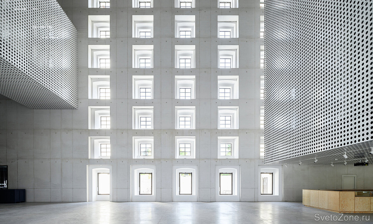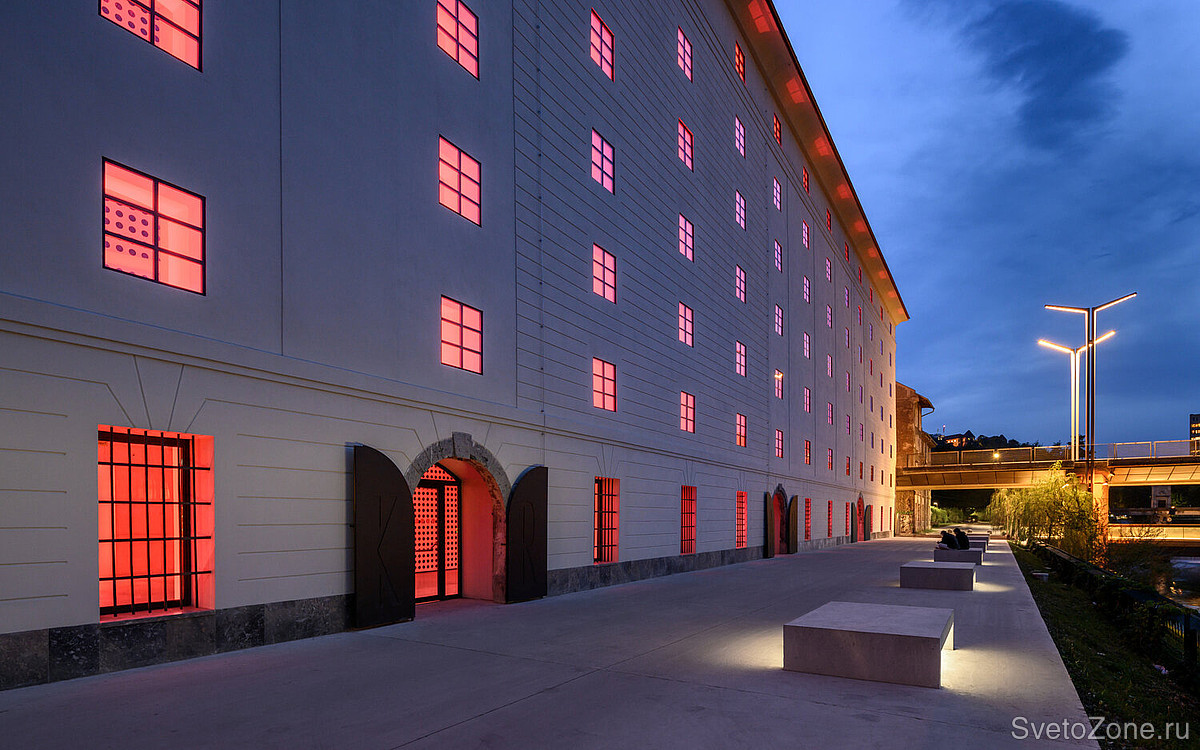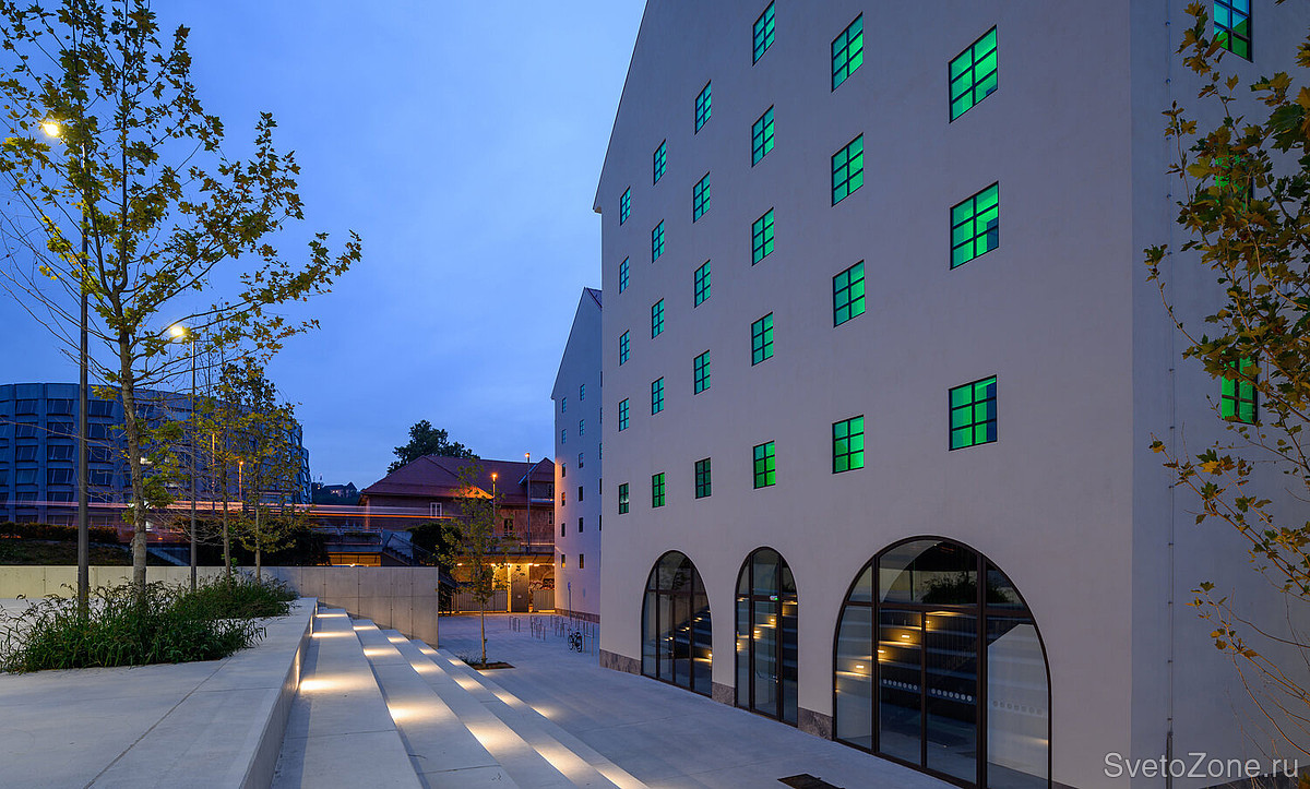 Поскольку окна являются сильнейшим ощутимым маркером, связывающим с прошлой идентичностью здания, световая работа с ними стала основополагающим моментом при разработке светового дизайна. Накладной светодиодный светильник GRIVEN EKLIPSE выбран в качестве главного инструмента, подчеркивающего общую концепцию. Приборы в исполнении RGBW установлены в оконные проемы и благодаря широкой эллиптической оптике полностью закрывают светом глубокие внутренние ниши. Таким образом, окно идеально подчеркнуты изнутри мягкими интенсивными цветовыми оттенками, которые могут совпадать или контрастировать с общими оттенками интерьера.
