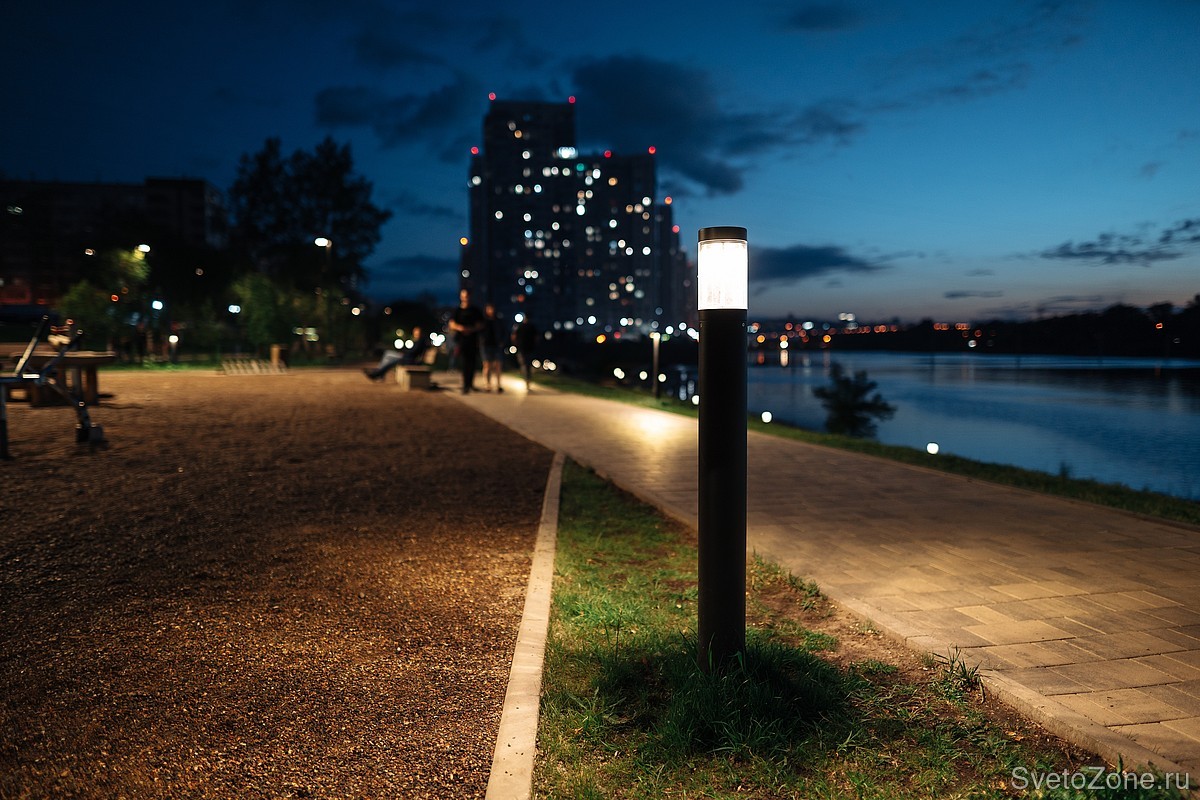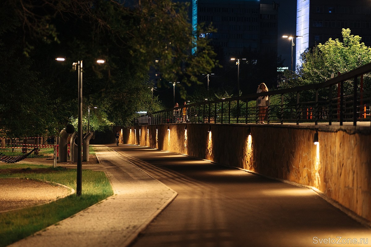 Основные пешеходные транзиты освещают уличные светильники LV-CITY. Консольные светильники, установленные на опоры высотой 3,5 метра, создают мягкое и комфортное освещение. Они освещают зоны отдыха, спортивные и детские площадки. Также на некоторые опоры вместе с LV-CITY установлены прожекторы LV-LIGHTSABER, создающие дополнительное освещение в пешеходных зонах.