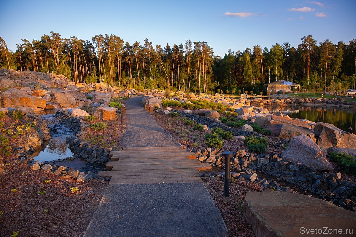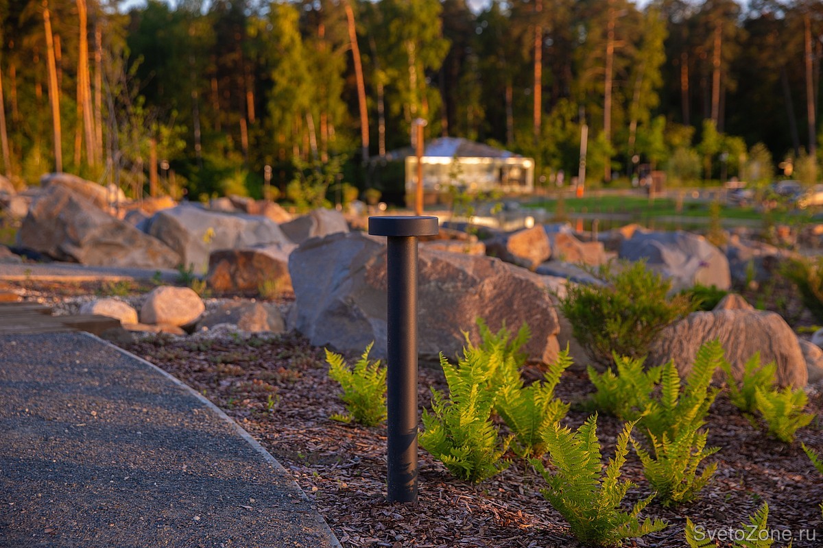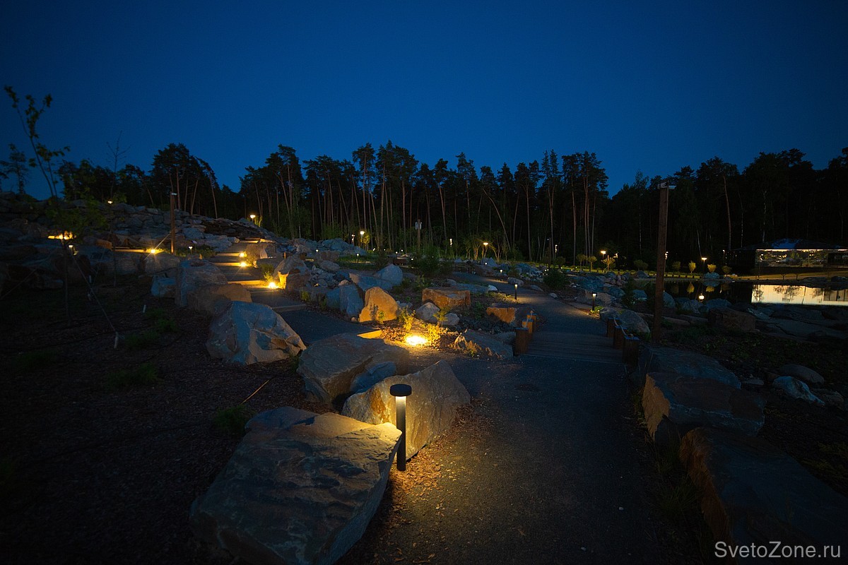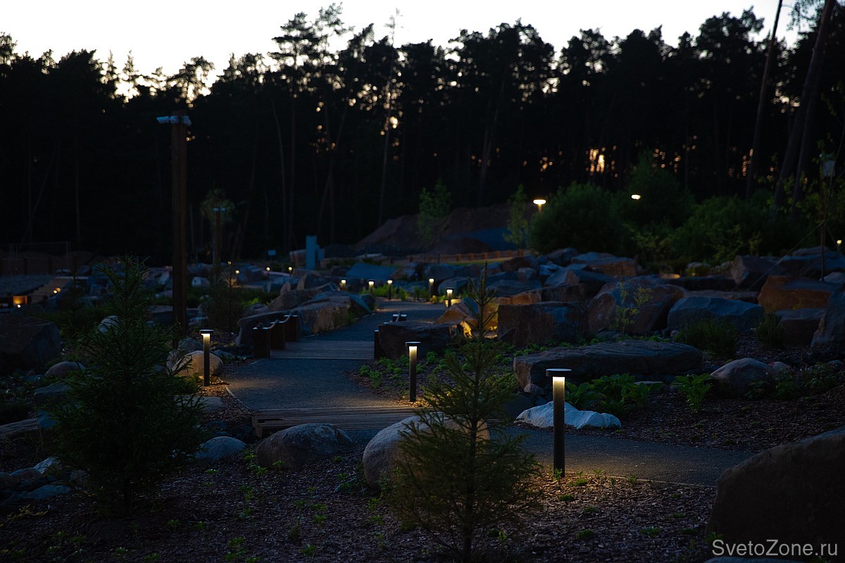 Пешеходные дорожки между камнями и скалами освещают болларды LV-BOLLARD TYPE-T. Светильники подчеркивают силуэты скал и ручейков в тёмное время суток. При этом «грибочки» высотой 700 мм не светят в глаза прохожих благодаря скрытому источнику света и матовому рассеивателю.