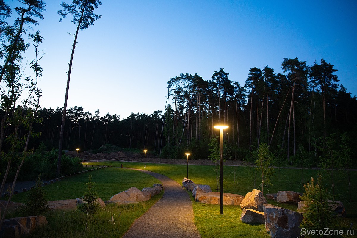 Торшерные светильники LV-TORCHERE отвечают за функциональное освещение. Световые приборы на опорах высотой до 5 метров освещают пешеходные транзиты, проходящие по периметру озера.