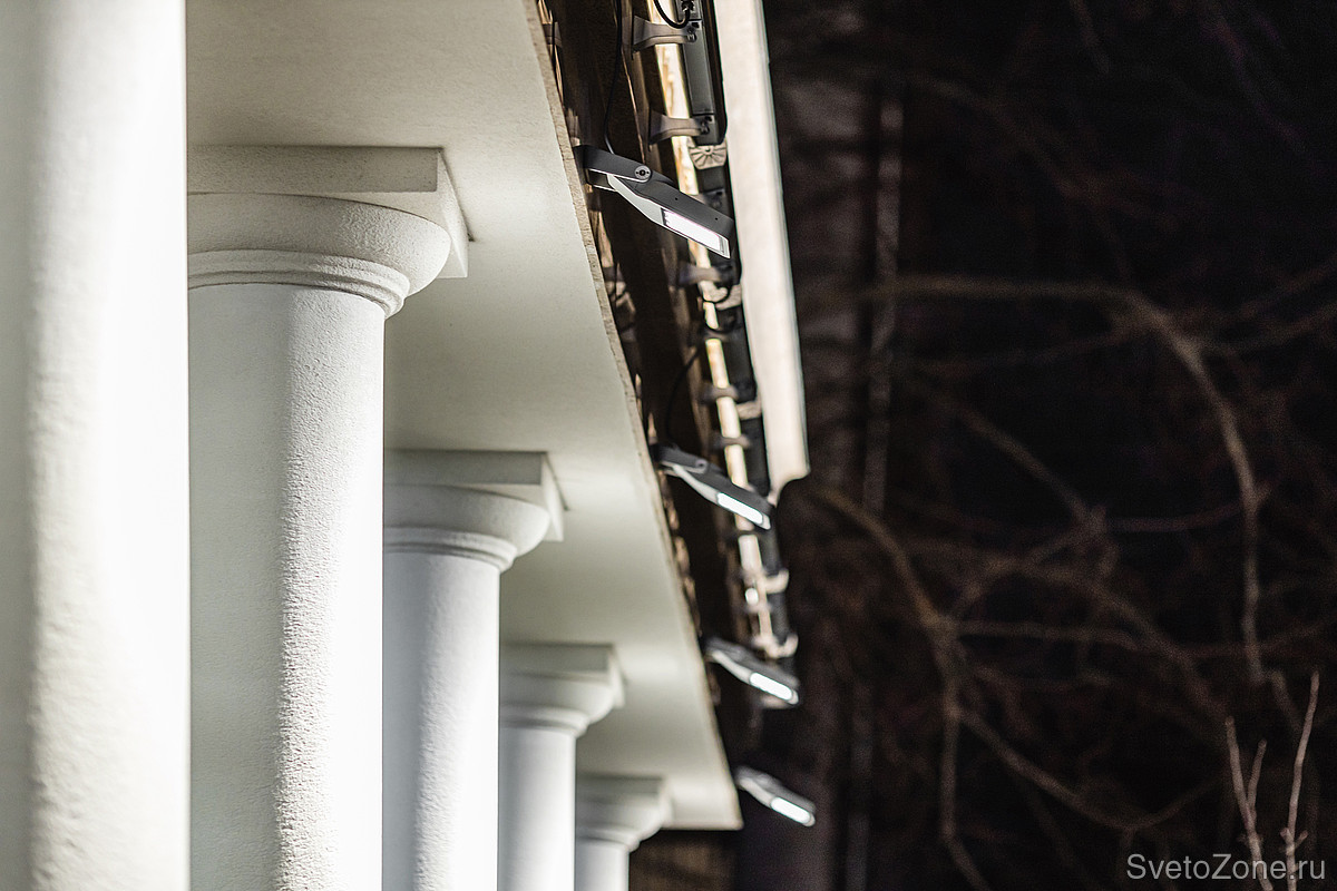 Уровень второй — освещение ризалита, как самой выдающейся архитектурной части. Ризалит включает в себя несколько элементов: колонны и портики. Их мы равномерно выделили с помощью приборов RAY, IntiROLL и IntiLINE, обращая особое внимание на сохранение объема форм.