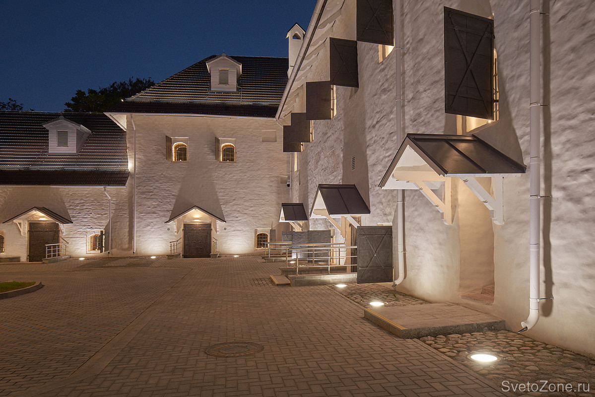 Концепция включает в себя равномерное освещение фасадов с дополнительным яркостными или цветовыми акцентами в окнах. На оборудовании INTILED были реализованы три здания комплекса: Поганкины палаты, Дом Ксендза, Псковская художественно-промышленная школа им. Фан-дер-Флита.