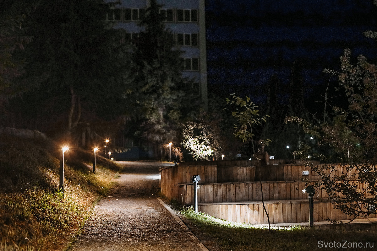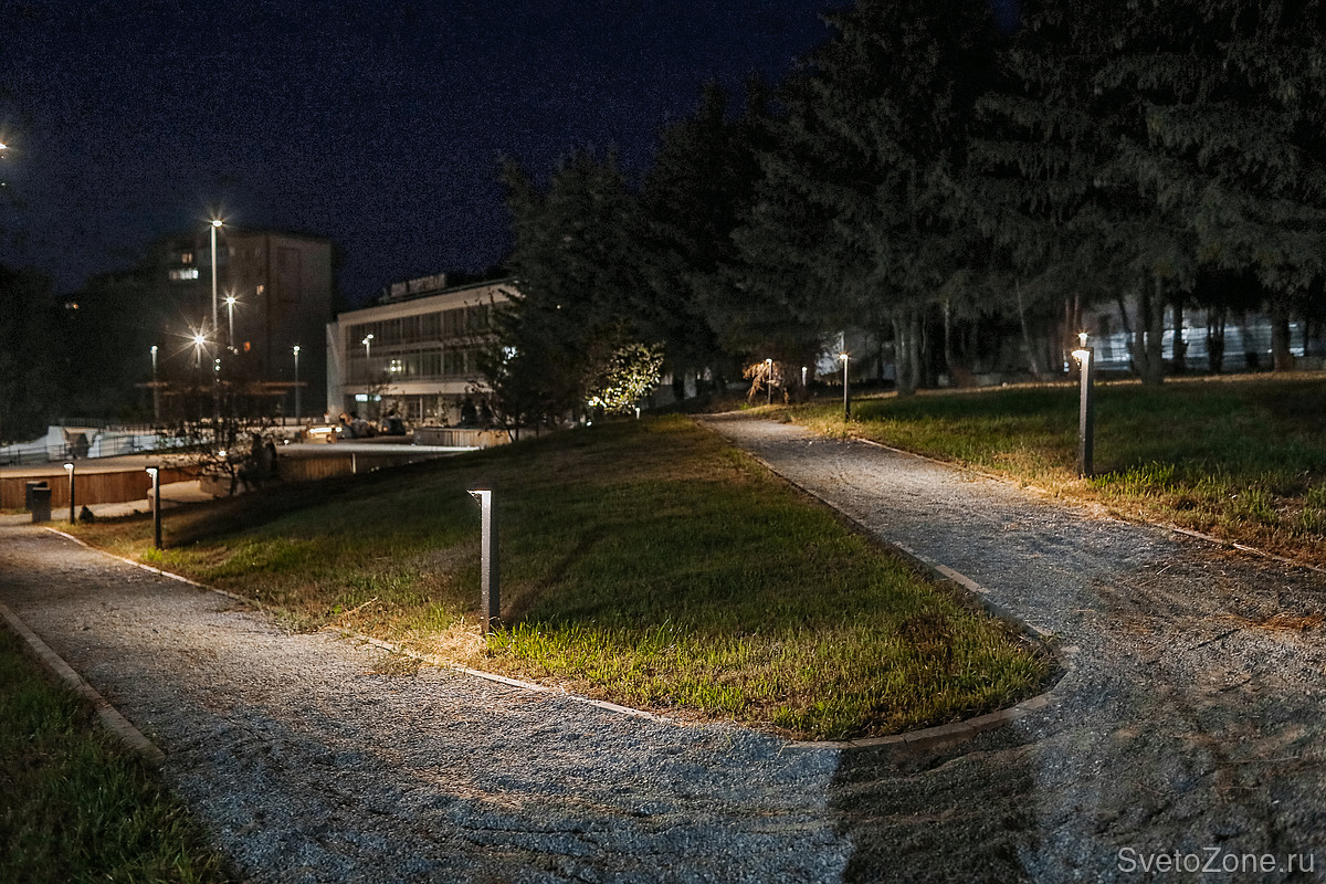 Уличные светильники Ledvizor отвечают за подсветку пешеходных дорожек. Болларды LV-SEVEN установлены на тропинках, отсыпанных гравием. Г-образные столбики укомплектованы линзами, которые даже при небольшой высоте светильника дают яркое и широкое пятно засветки. При этом скрытый от глаз источник света, не слепит глаза проходящим людям.