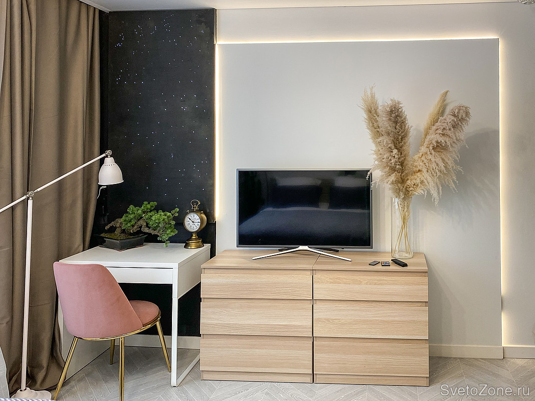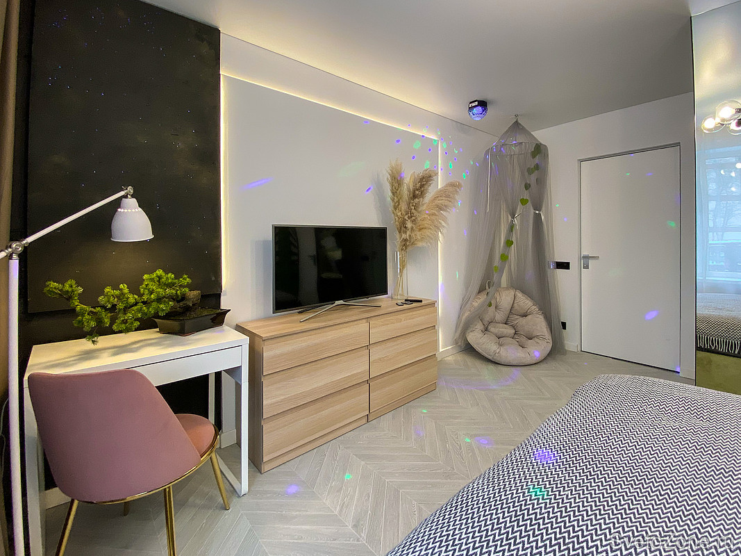 Дизайн-проект спальни, реализованный в рамках проекта «Битва дизайнеров». Дизайнер Надежда Радунцева использовала в интерьере нейтральные натуральные оттенки. Мягкая подсветка добавила стенам объема и визуально увеличила границы помещения. В лаконичный и дизайн спальни подчеркнут дополнительными световыми акцентами.