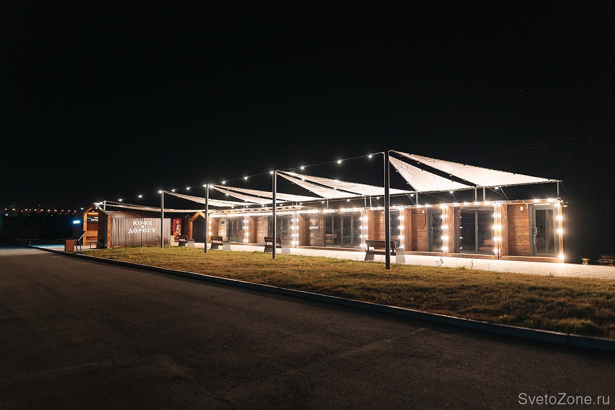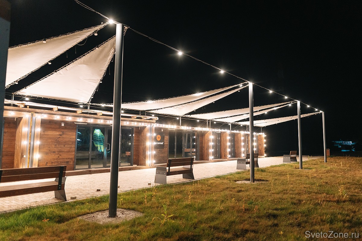 Освещение пешеходных зон под навесами обеспечивают уличные подвесные светильники LV-FESTOON. Помимо функционального освещения, приборы создают очень уютную и атмосферную подсветку.