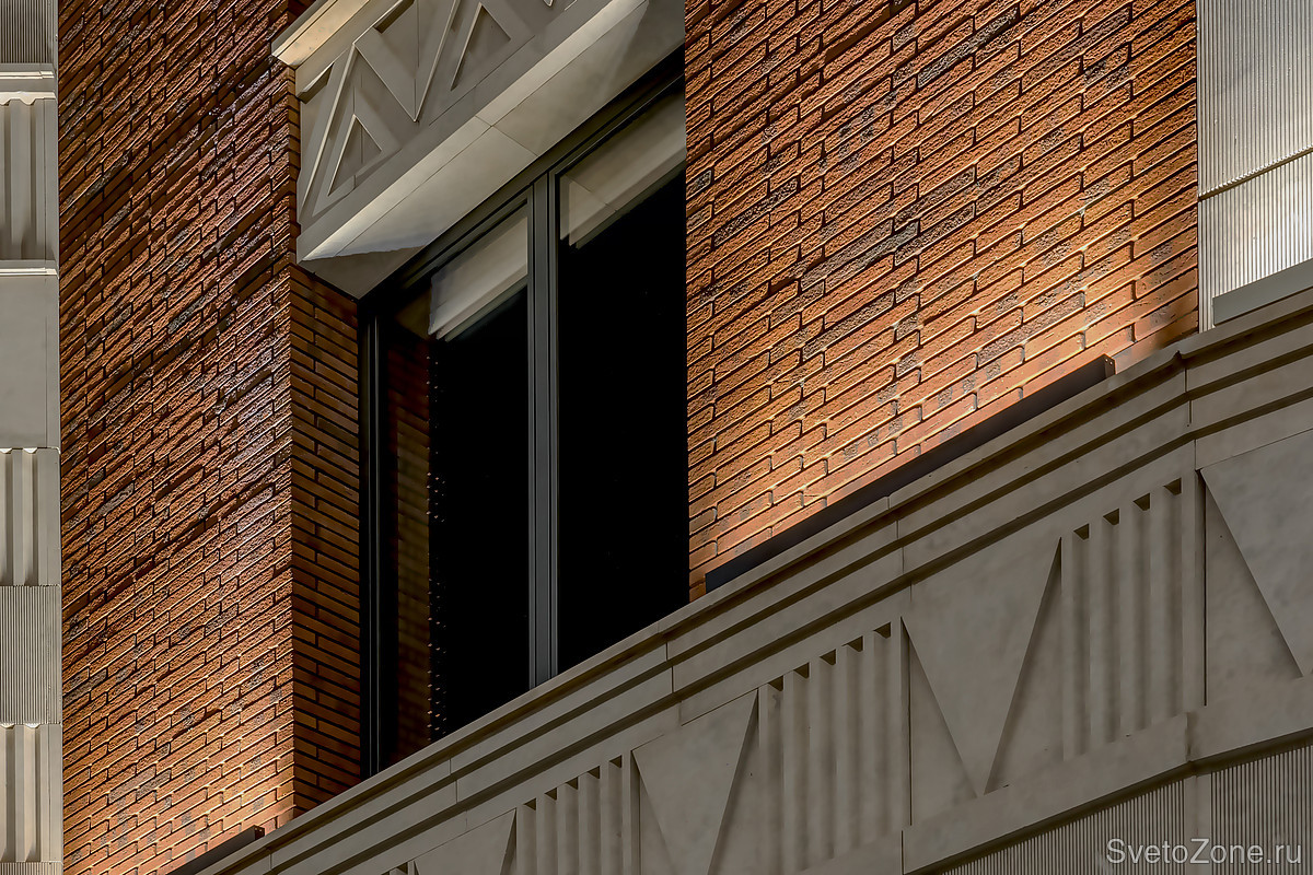 Скользящий свет — идеальное решение для фасадов с богатой фактурой. Линейные светильники RADUGA™ LUMEN имеют удобные кронштейны крепления, которые позволяют направлять световой поток точно под нужным углом к освещаемой поверхности. Благодаря этому создается равномерная подсветка, выгодно оттеняющая текстуру современных облицовочных материалов и рисунок отделки.