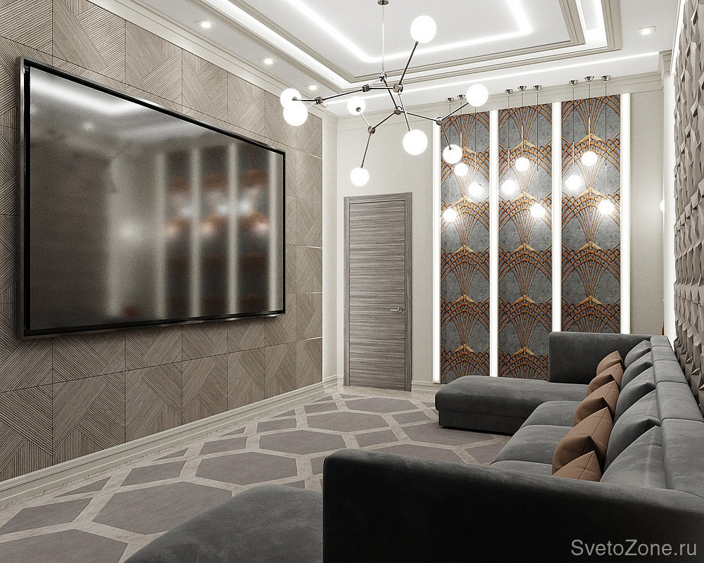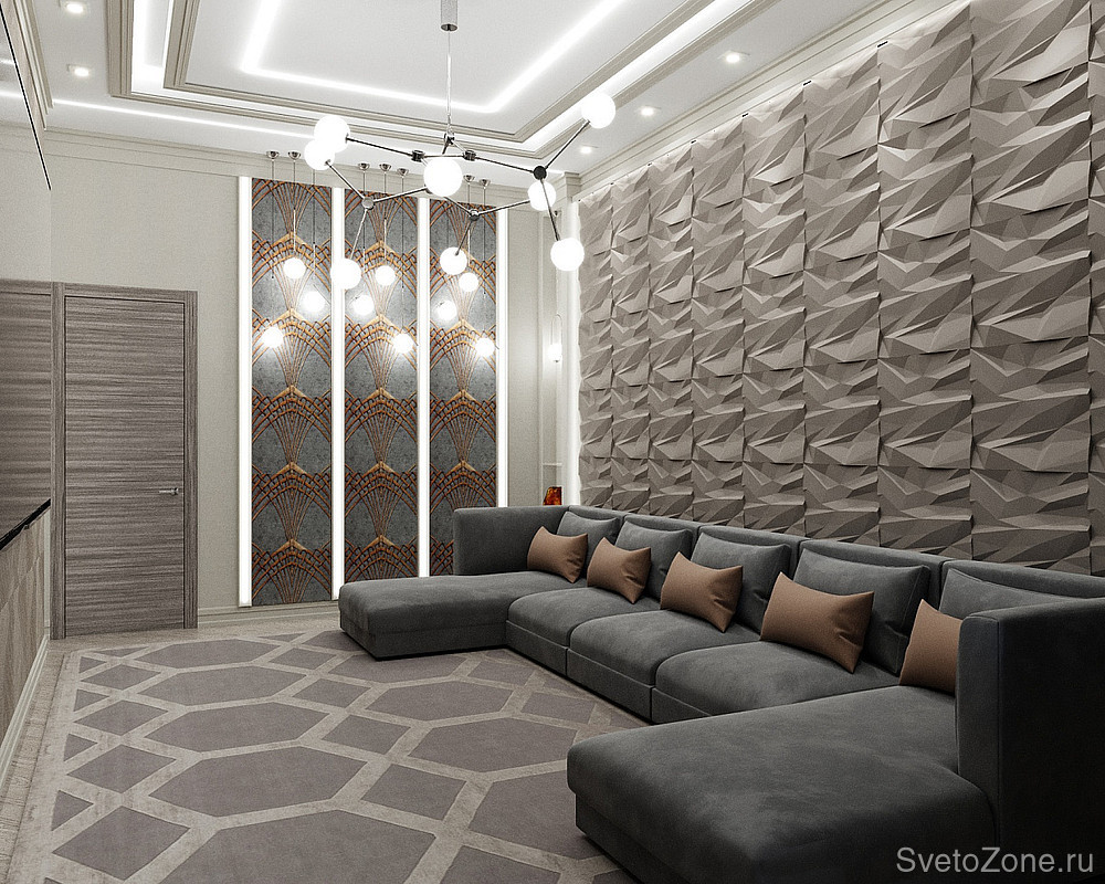 Световое оформление домашнего кинотеатра предусматривает многоуровневую систему освещения. Одним из источников света и одновременно арт-объектом стали широкие световые панели, для создания которых использовалась многорядная светодиодная лента. Благодаря высокой плотности размещения светодиодов на ленте создается равномерная яркая засветка, а матовый экран из поликарбоната способствует мягкому рассеиванию и позволяет избежать эффекта видимых точек светодиодов. Монтаж ленты осуществлен на алюминиевый профиль белого цвета, который идеально вписался в дизайн комнаты. Линии профиля удачно подчеркивают геометрию панелей даже при выключенном освещении. Подсветка панелей в домашнем кинотеатре выполняет декоративную роль, а так же может использоваться в качестве дополнительной подсветки. Для этого предусмотрена возможность регулировки яркости свечения с помощью диммера и дистанционного пульта или панели управления.