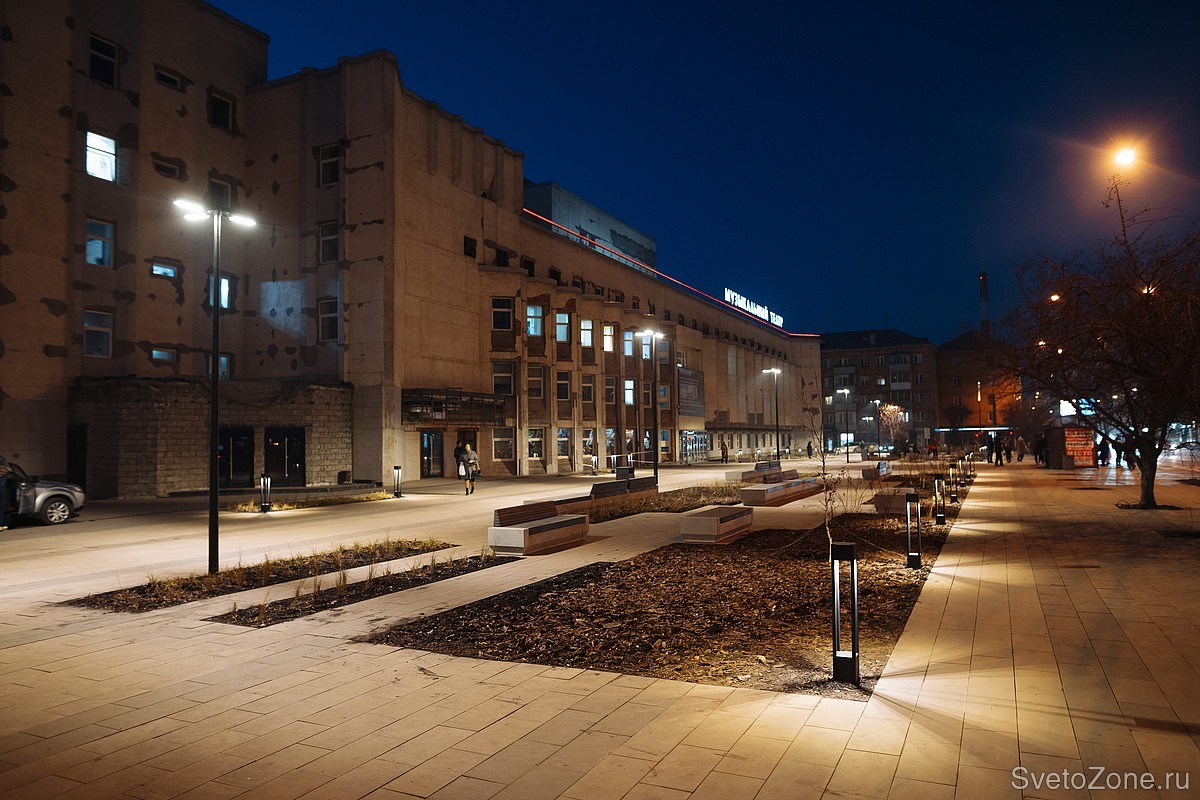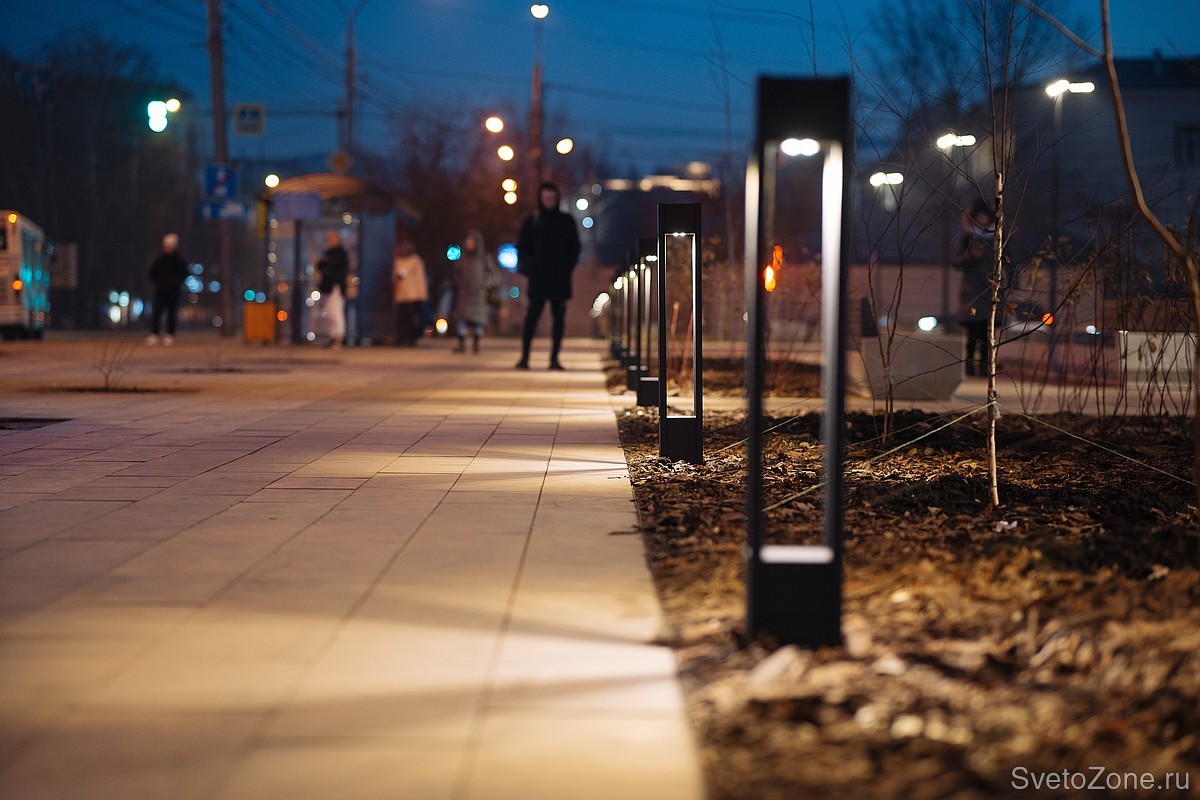 За функциональное освещение пешеходных транзитов отвечают LV-CITY G2. Новые консольные светильники Ledvizor установлены на опорах по 3 прибора. Светильники не слепят в глаза прохожим и направляют свет только на целевые зоны. Это возможно благодаря наличию оптики, защитному кожуху и возможности юстировать прибор по углу наклона при монтаже.