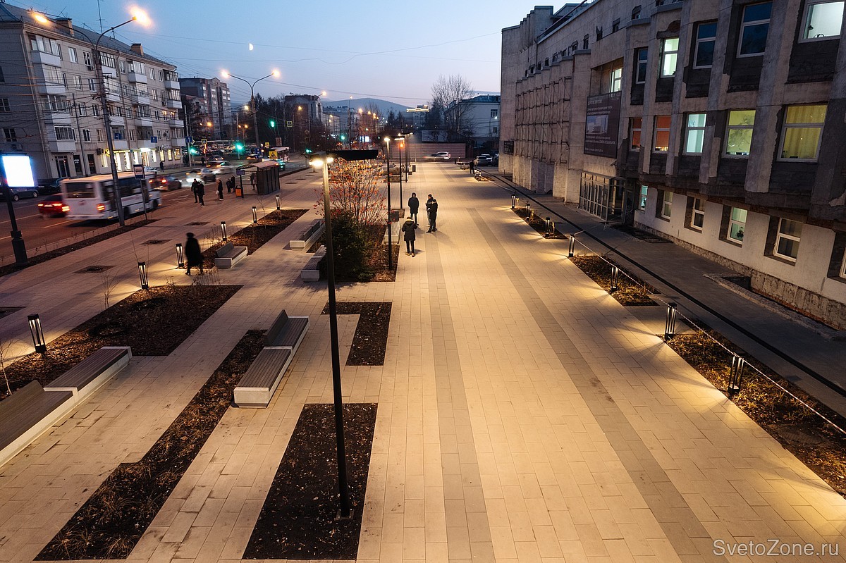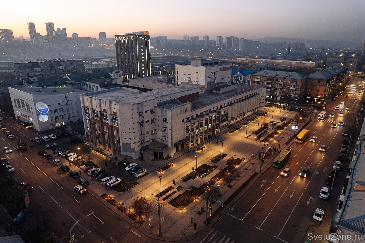 Проект благоустройства площади возле Красноярского Музыкального театра завершился осенью 2022 года. Здесь сделали просторную пешеходную зону, обустроили места отдыха с лавочками и установили другую уличную мебель. Вблизи главного входа в театр установили конструкции для афиш. На площади появились новые деревья и кустарники, велопарковки и светодиодные светильники.