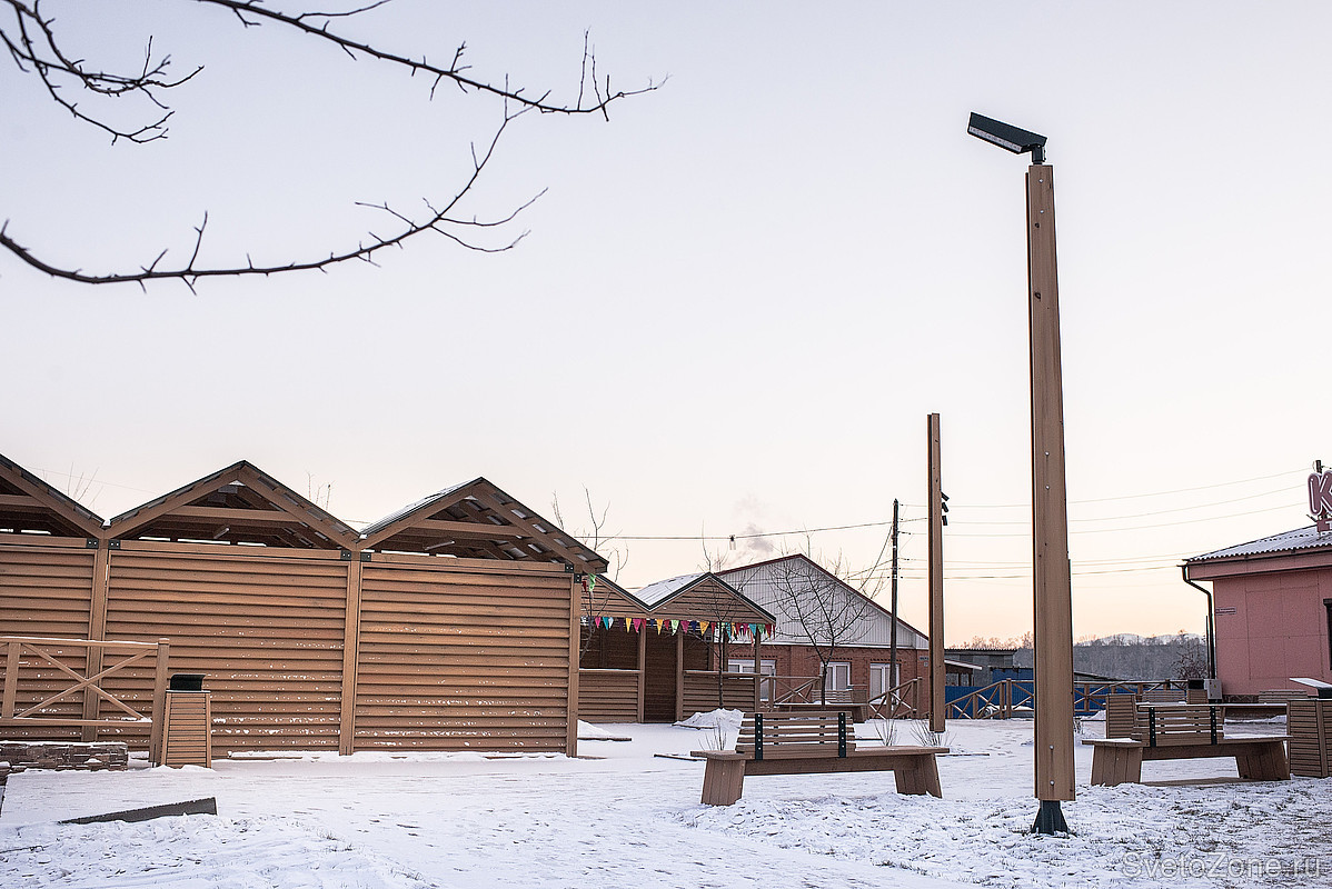 Оборудование Ledvizor лаконично вписалось в облик «деревянного» общественного пространства. Вечером светильники наполняют площадь тёплым уютным светом, а днём сами становятся эстетичным элементом благоустройства.