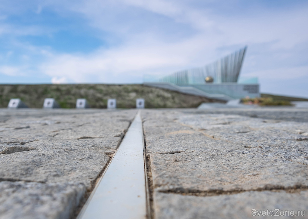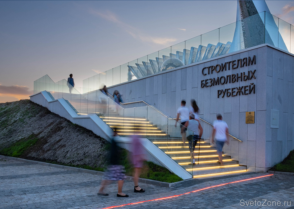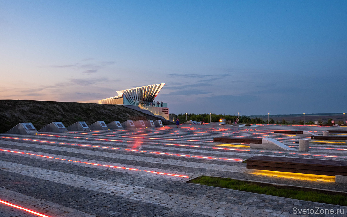 Весь комплекс, вплоть до каждого источника света, погружает посетителей в трагическое и героическое прошлое нашего народа времён Великой Отечественной Войны. Следы трассирующих пуль напоминают красные прерывистые линии грунтовых светильников RADUGA™ INTERRA CU, встроенных в брусчатку. При этом днем светильники не выделяются на фоне камня благодаря монтажу в единую линию вровень с поверхностью. С наступлением темноты 888 метров красных линий создают на площади мемориала драматическую атмосферу.