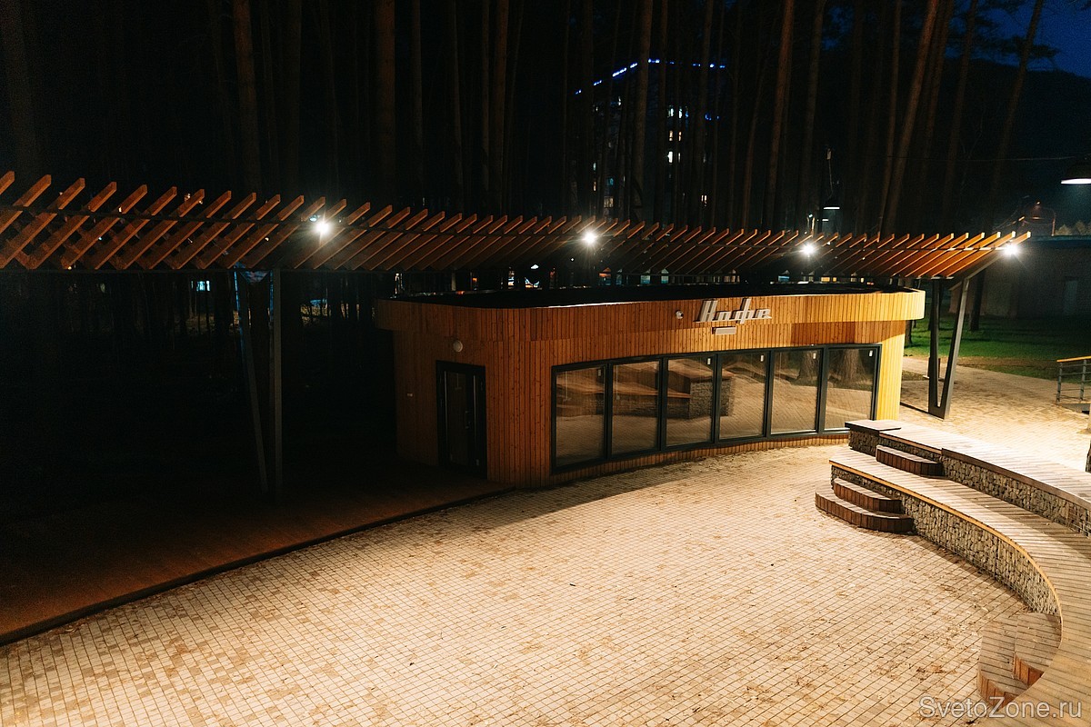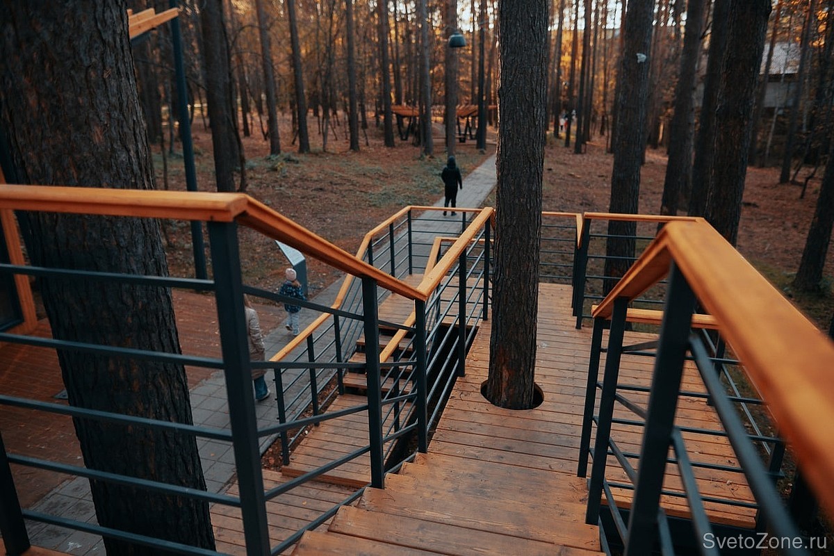 В парке появились детские площадки, пешеходно-прогулочные зоны, кафе и сцена с амфитеатром. Для сохранения корневой системы и минимизации воздействия на сложившийся ландшафт в парке установили 95 опор для расположения тросовых конструкций, на которые подвесили светильники.