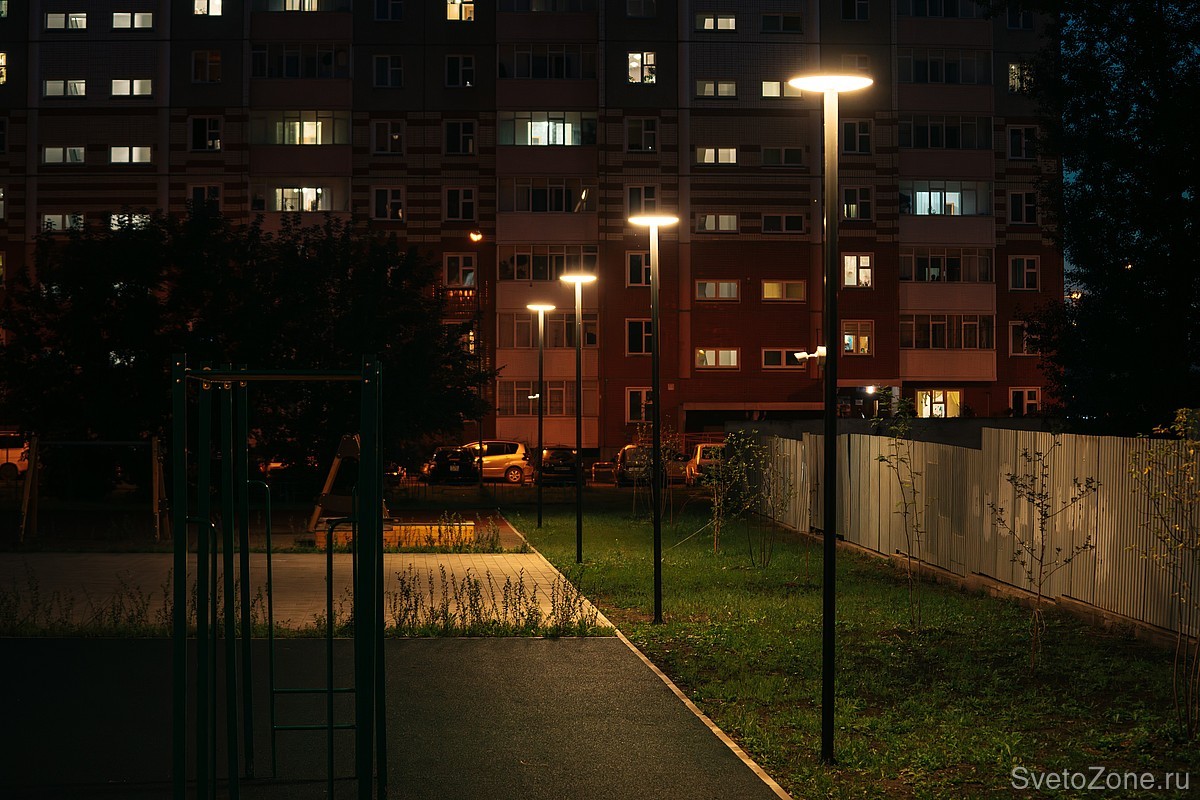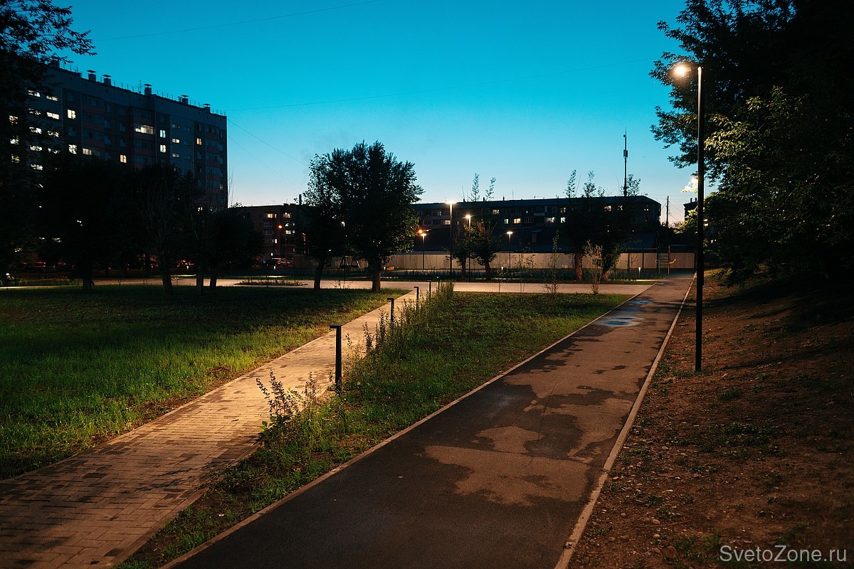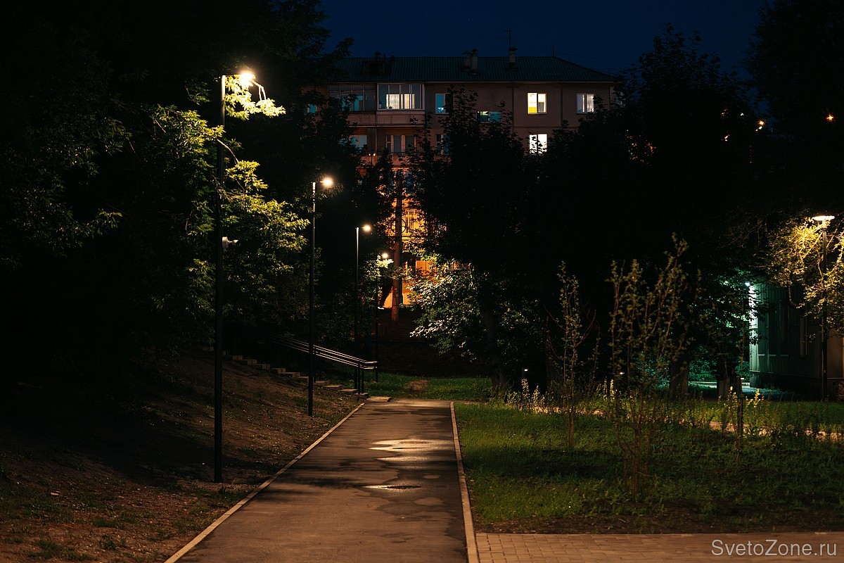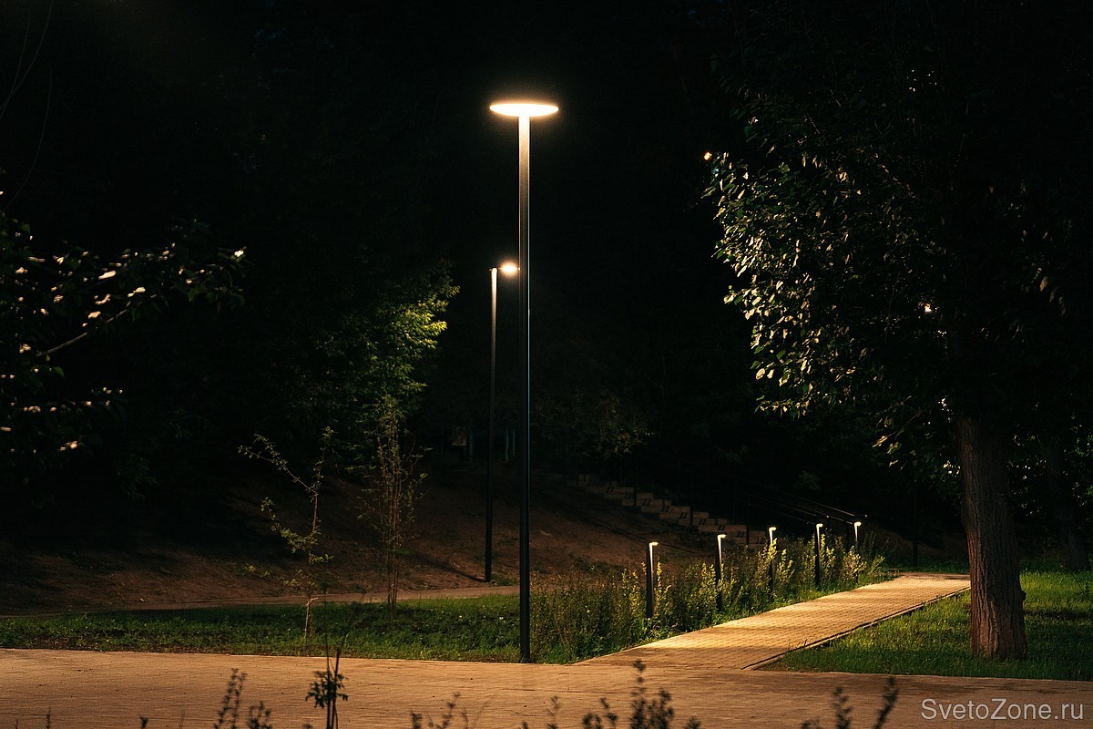 Территорию вокруг детских площадок и мест отдыха освещают LV-TORCHERE. Торшерные светильники с цветовой температурой 3000 К и матовым рассеивателем создают мягкий и комфортный свет, наполняют парк атмосферой тепла в вечернее время.