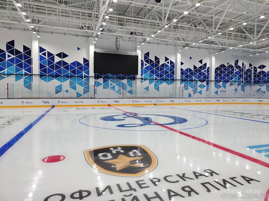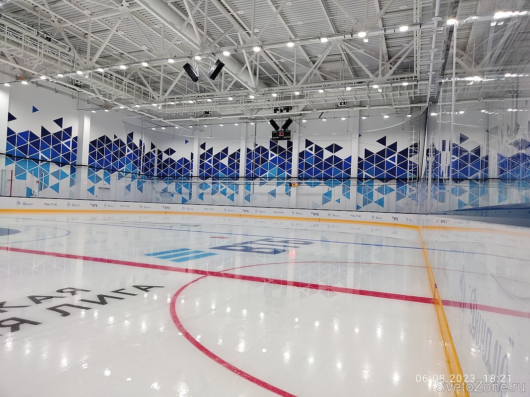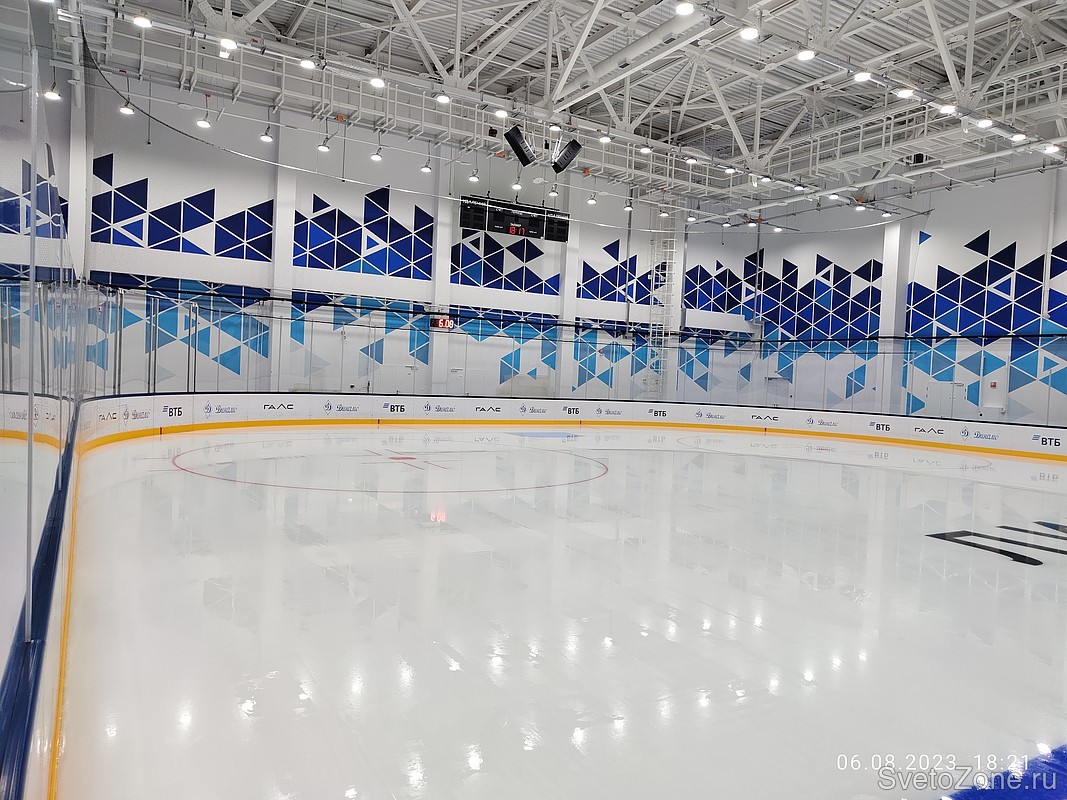 Светодиодное освещение позволило создать комфортные условия для проведения занятий и игр. Для освещения ледовой арены применили светодиодные светильники Wheel (ТМ FEREKS) с высоким индексом цветопередачи CRI90 и цветовой температурой 5700К, в соответствии с требованиями к освещению спортивных объектов для проведения телетрансляций. Всего потребовалось установить 160 светильников. Средний уровень освещенности на ледовой площадке составил 3000 люкс. |