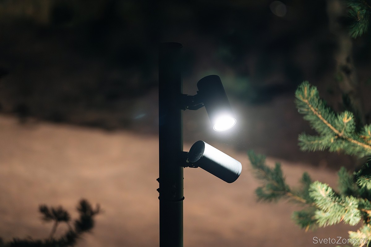 Тропинки освещают ландшафтные прожекторы LV-LIGHTSABER мощностью 20 Вт с цветовой температурой 3000 К. Светильники установлены на опоры с помощью кронштейнов LV-POLE-CLAMP и LV-MULTIHEAD.