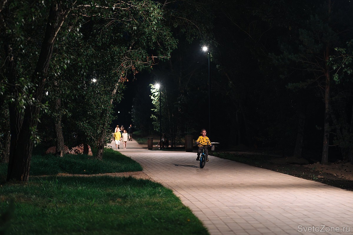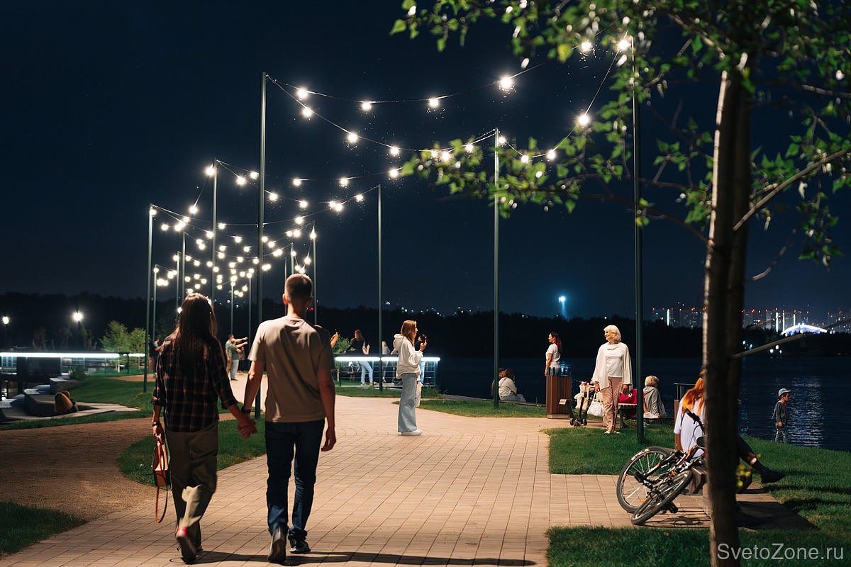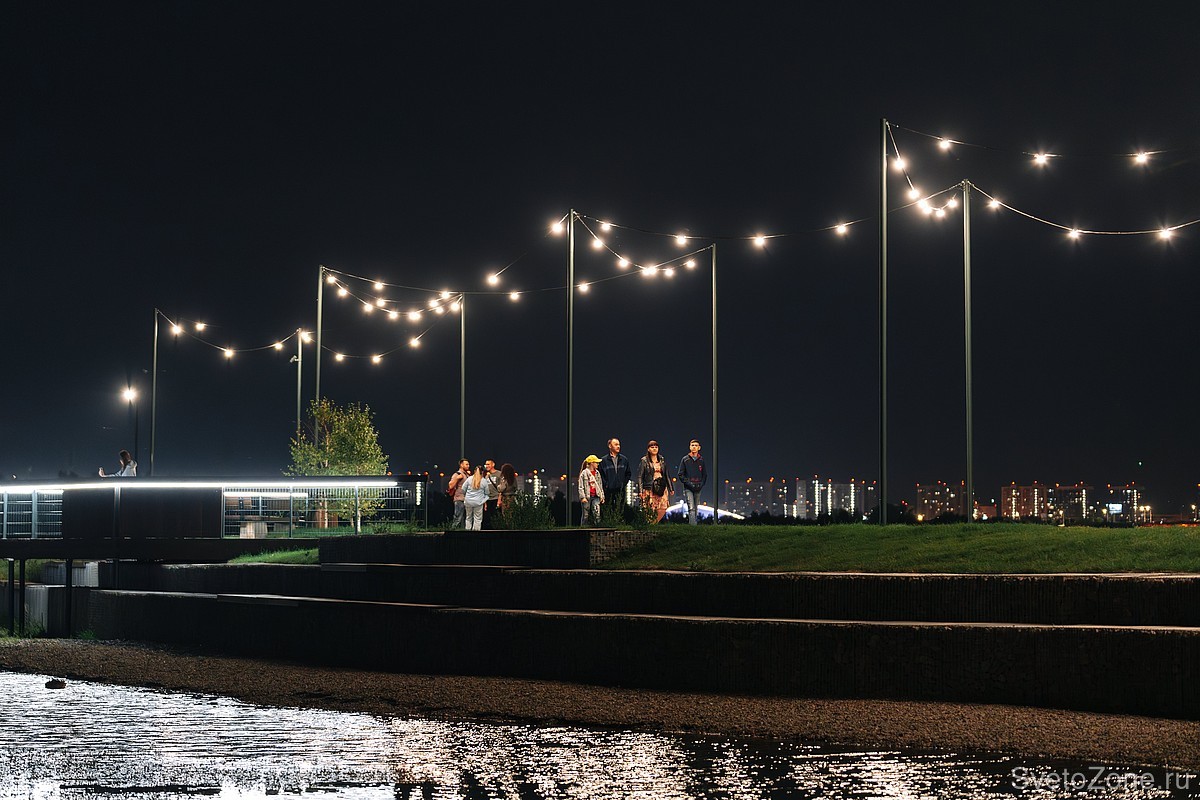 Главная аллея освещается с помощью подвесных светильников LV-FESTOON . Приборы установлены на трос группами по 5 штук между опорами. Светильники создают комфортный тёплый свет и не слепят в глаза прохожим.