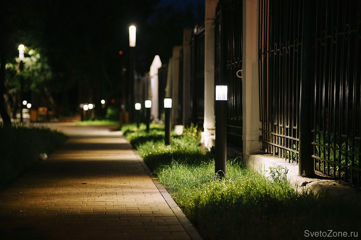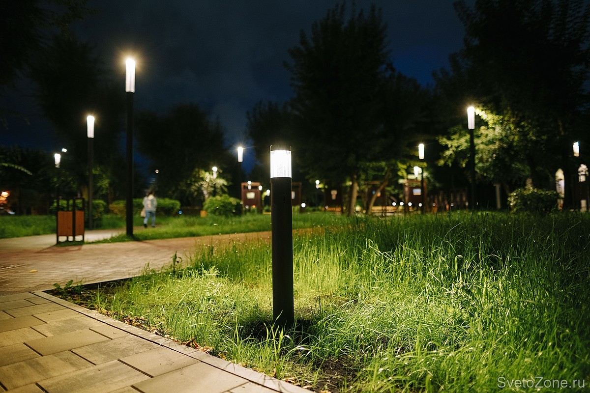 Вдоль тропинок установлены LV-BOLLARD. Столбики расставляют дополнительные световые акценты и акцентируют внимание на элементах благоустройства.