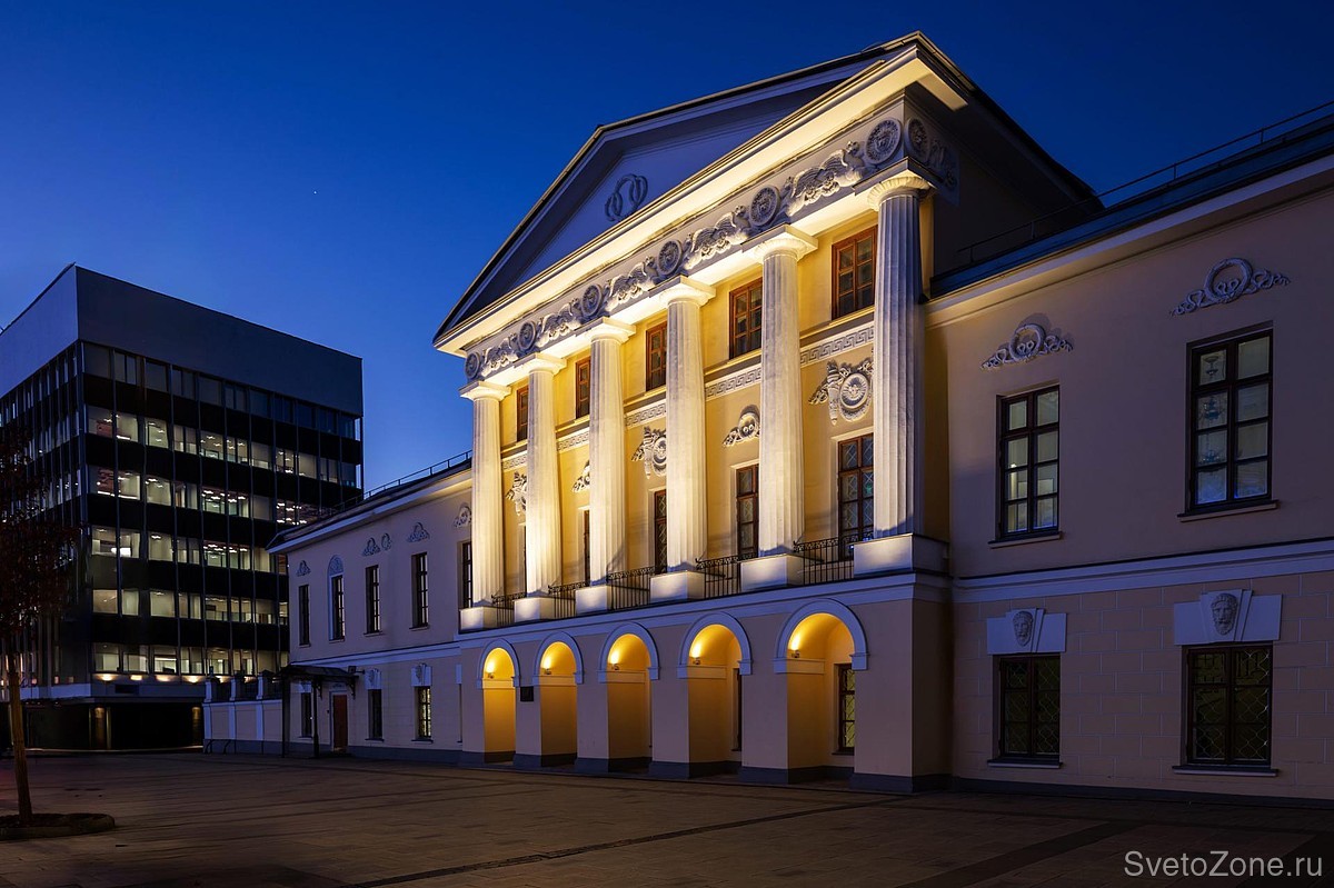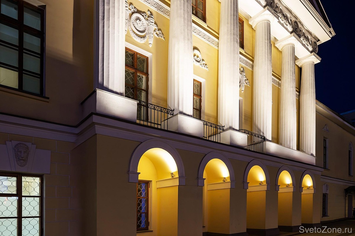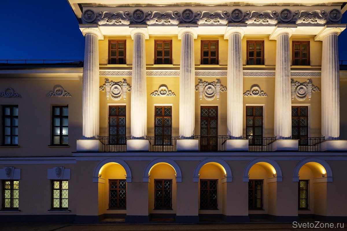Компактные, но мощные светильники APEX ярко выделяют колонны и великолепную лепнину фриза дорического портика. Благодаря овальной оптике 15х55 градусов удалось получить равномерную заливку. Наполненные светом архитектурных прожекторов SIGNUM 18 арочные проемы первого этажа придают мезонину ажурную легкость, словно приподнимая его над землей.