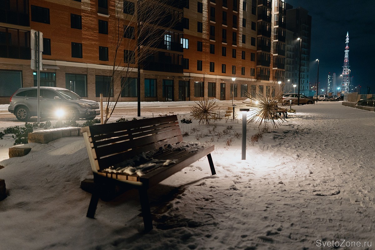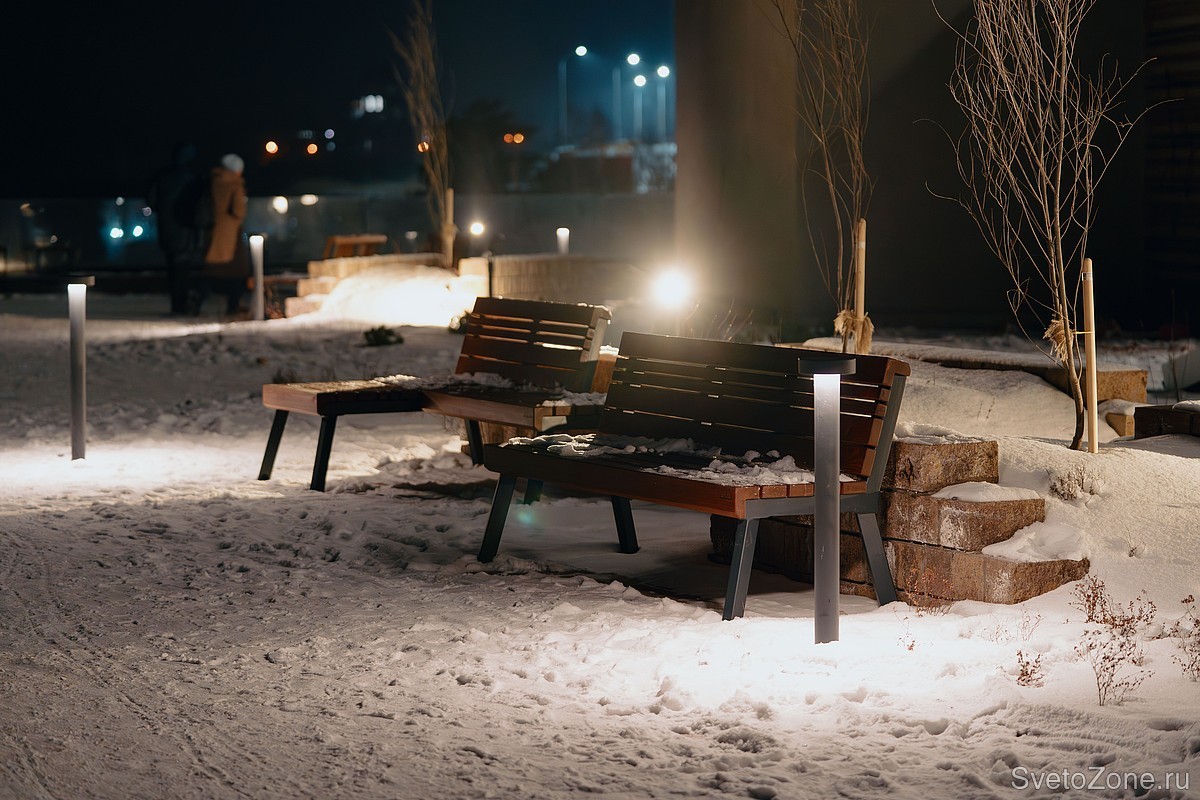 На маршрутах вдоль набережной Енисея установлены консольные светильники LV-PARK. Тропинки променада освещают LV-TORCHERE. Дизайн светильников гармонично вписывается в местную среду, а тёплая цветовая температура 2700 К создаёт уютную атмосферу.