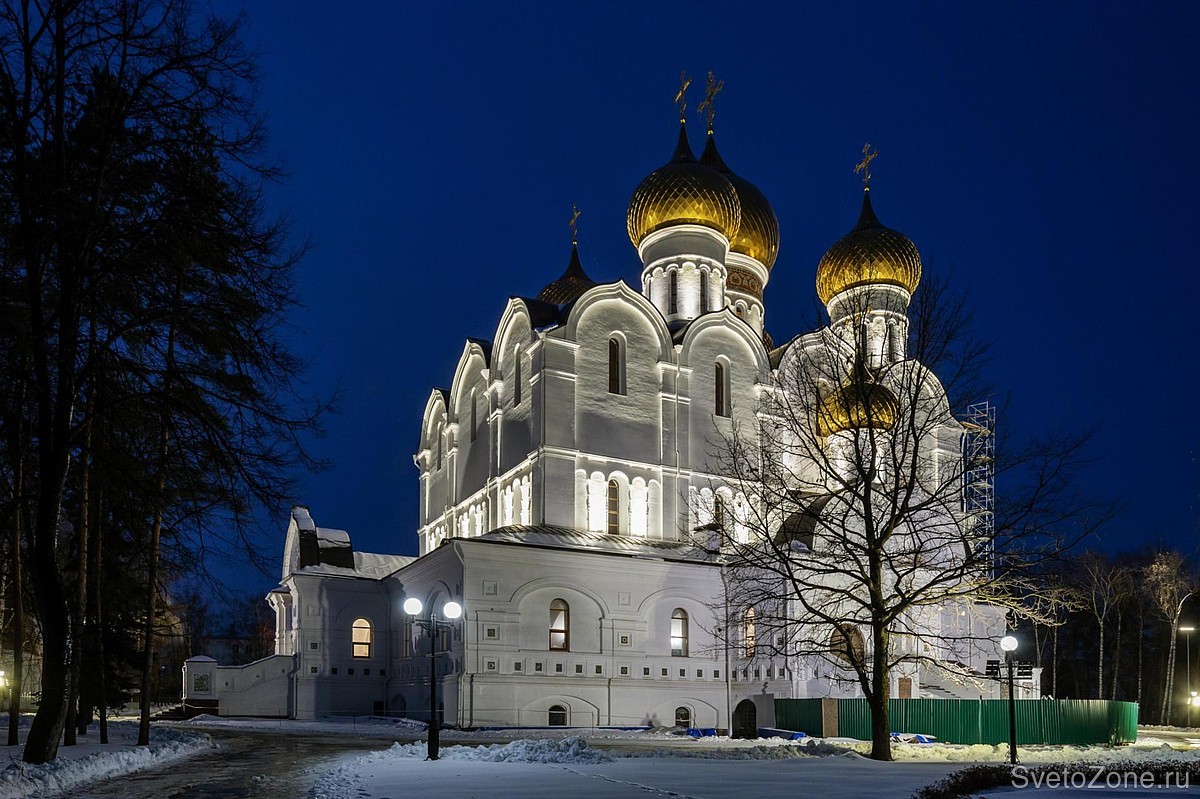 Белокаменные стены освещаются с земли мощными прожекторами RADUGA Stria X3 для заливающего архитектурного освещения высотных зданий и сооружений. Каждый модуль этого светильника имеет индивидуально настраиваемый угол наклона. Угол поворота корпуса по горизонтали составляет 180°. Это позволяет максимально точно направлять световой поток.