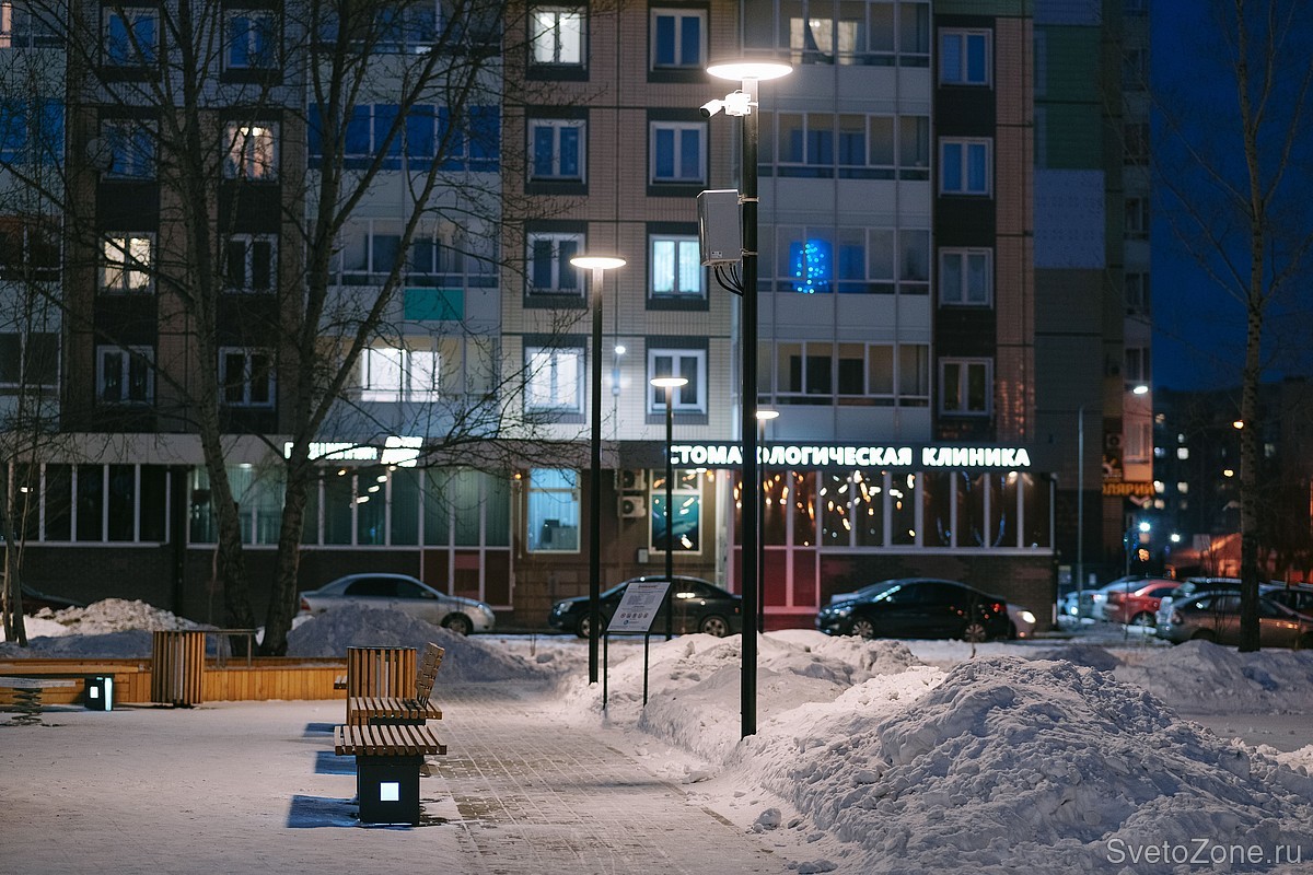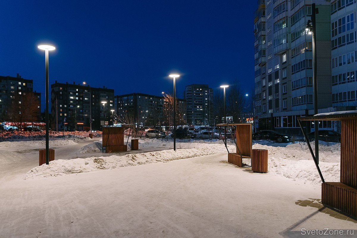 Территорию детской площадки, места для отдыха и МАФы освещают светодиодные прожекторы "LV-LIGHTSABER". Приборы установлены на опоры с помощью кронштейнов.