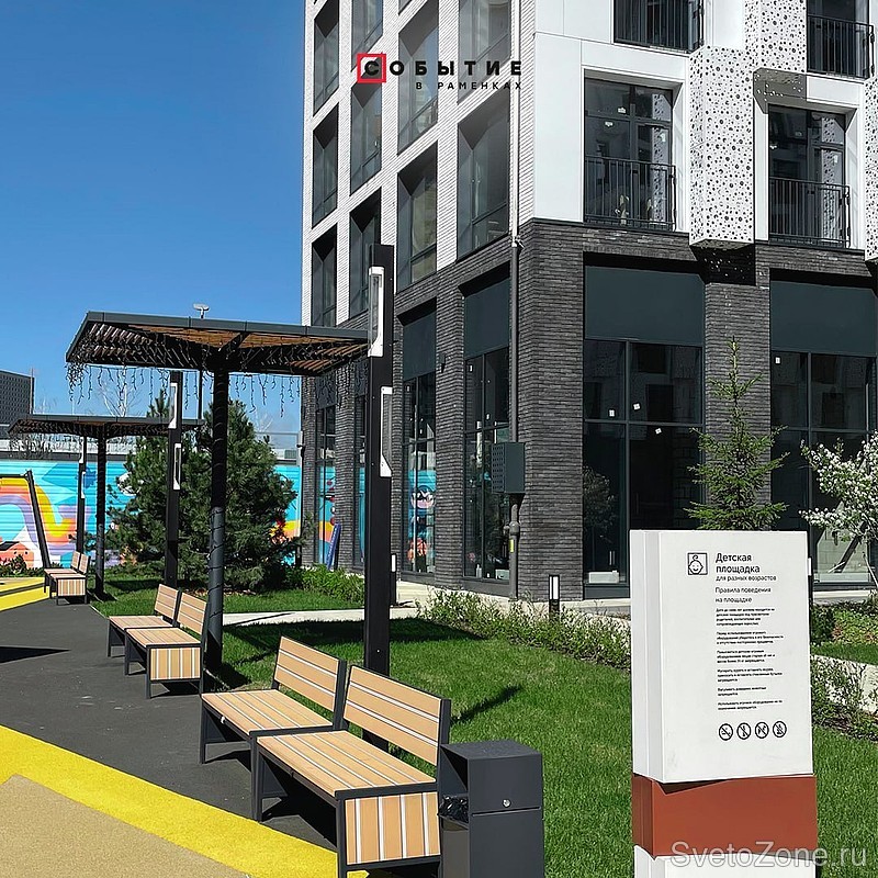 За функциональное освещение жилого комплекса отвечают двунаправленные светильники LV-OBLONG . Они освещают пешеходные дорожки, детские и спортивные площадки. Благодаря цветовой температуре 3000 К, территория обретает уютную атмосферу.