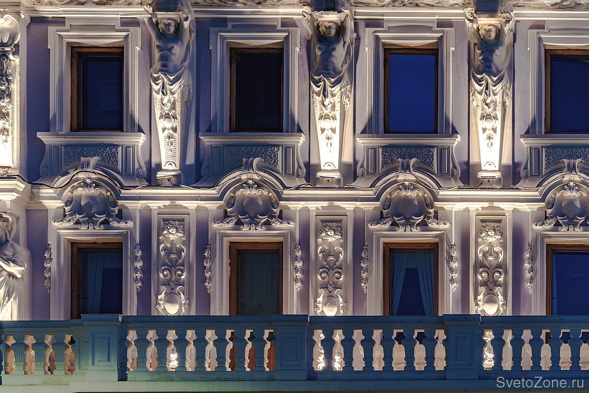 Миниатюрные линейные светильники RADUGA ™ LUMEN органично дополняют эстетику фасада, сливаясь с архитектурой и обеспечивая эффектную подсветку деталей, из которых складывается пышное убранство палаццо: фигуры атлантов и кариатид, лепные украшения межоконных простенков, скульптурные фигуры. |
