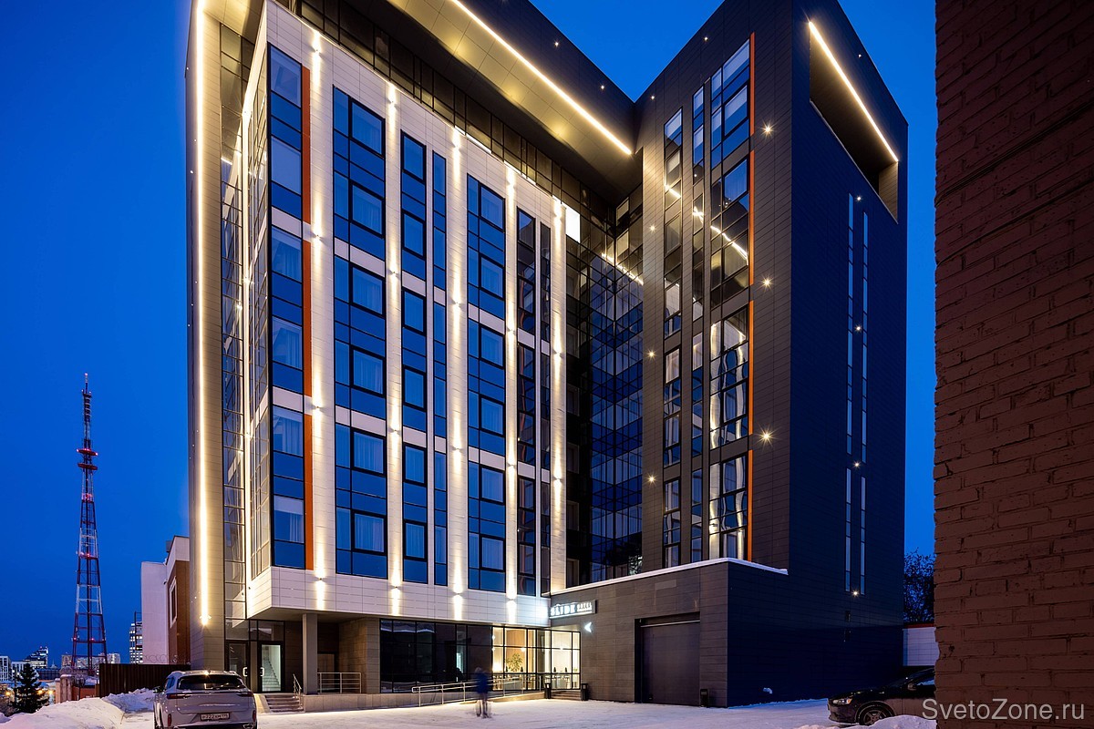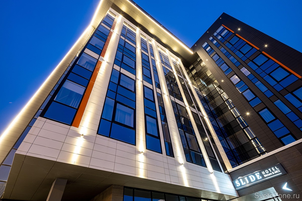 По-деловому сдержанный современный стиль в архитектуре SLIDE HOTEL в Екатеринбурге определяет подходы к архитектурному освещению.