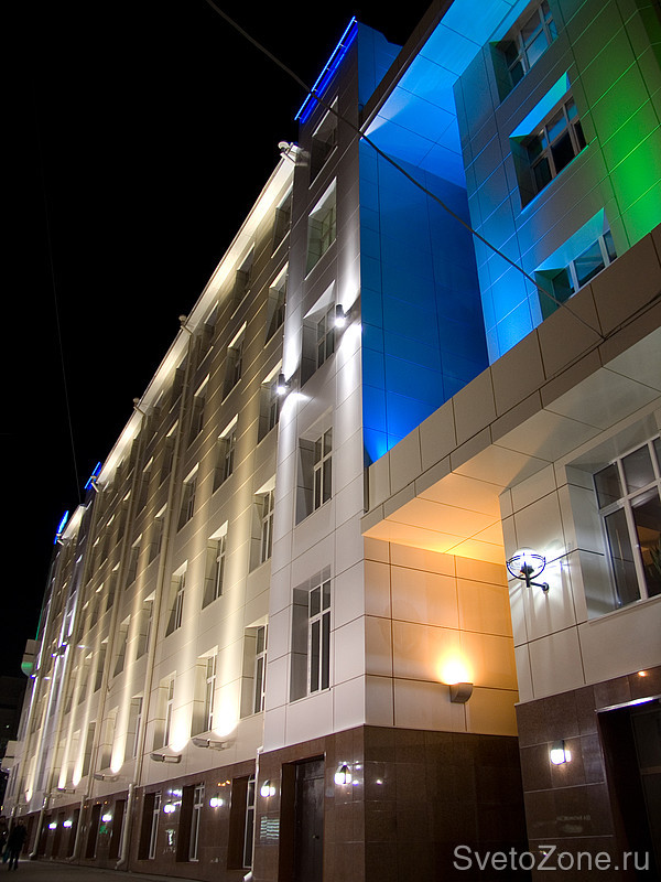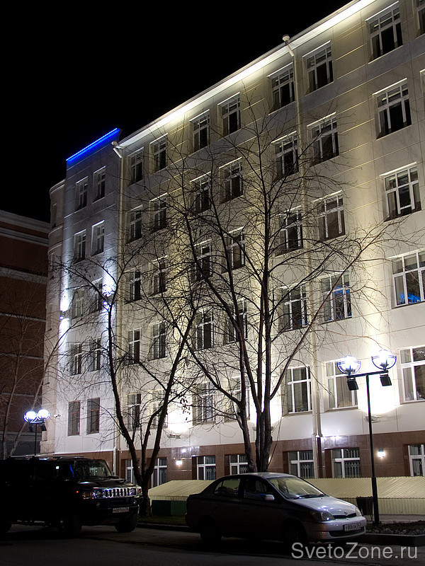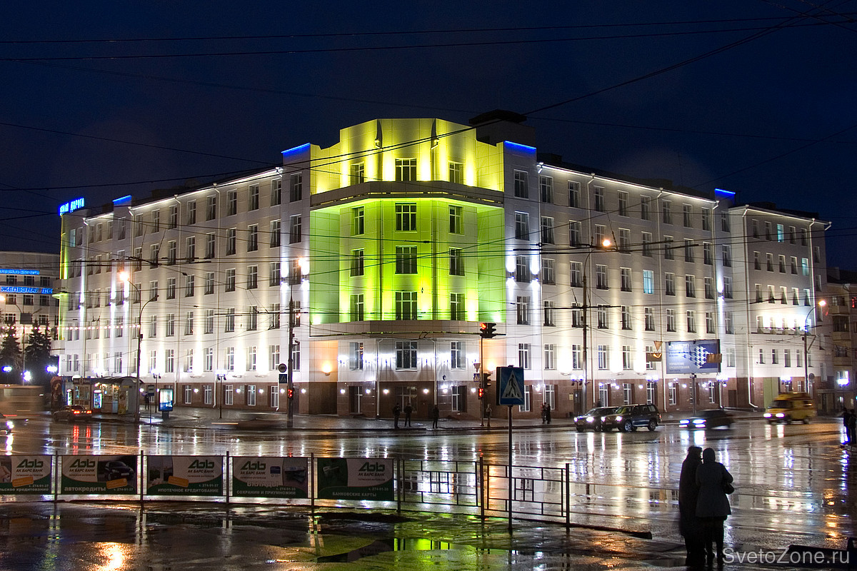 Во время реконструкции фасадов здания, разрабатывался проект архитектурного освещения здания с использованием светодинамики.