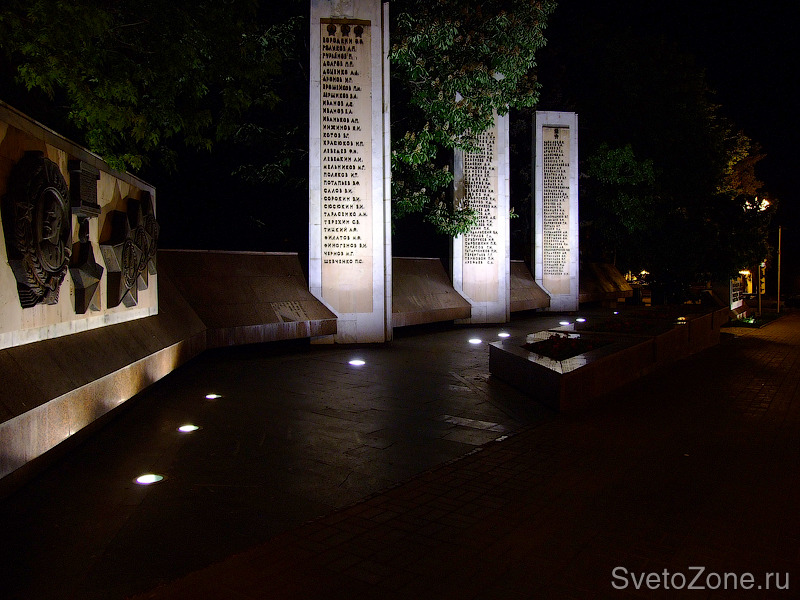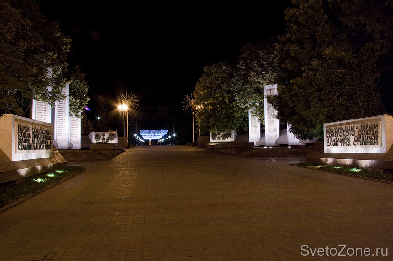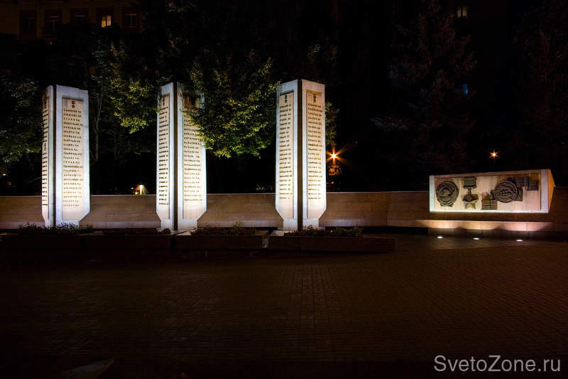 Для подсветки стел и панно применены встроенные в мощение и грунт светильники с узкой и широкой оптикой. Особенность расположения объекта и встроенный характер размещения приборов дает ощущение того что стелы светятся сами по себе. Такое ощущение возникает из-за того, что сами источники света практически не видны. Для качественной равномерной заливки поверхностей применены приборы с асимметричной и регулируемой оптикой. |