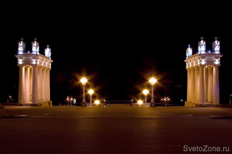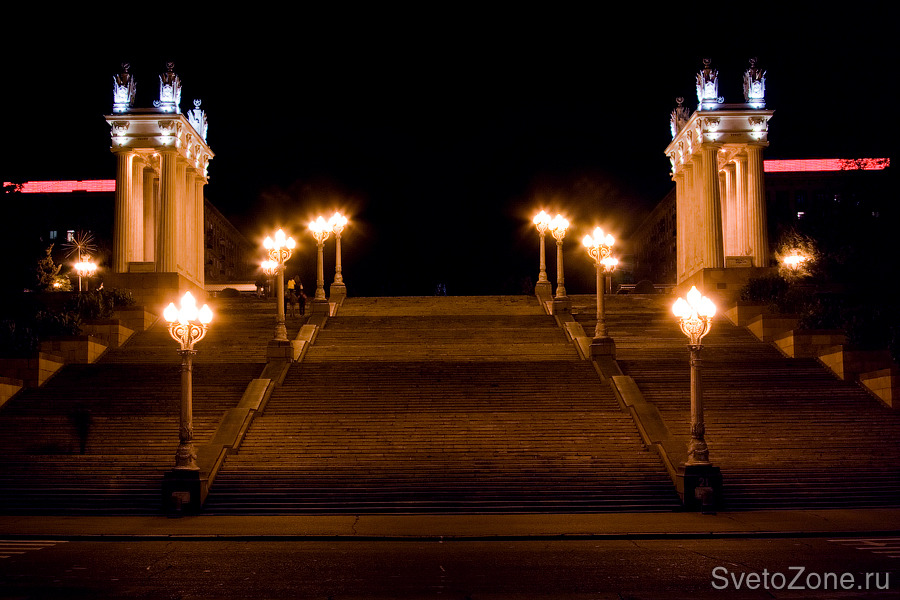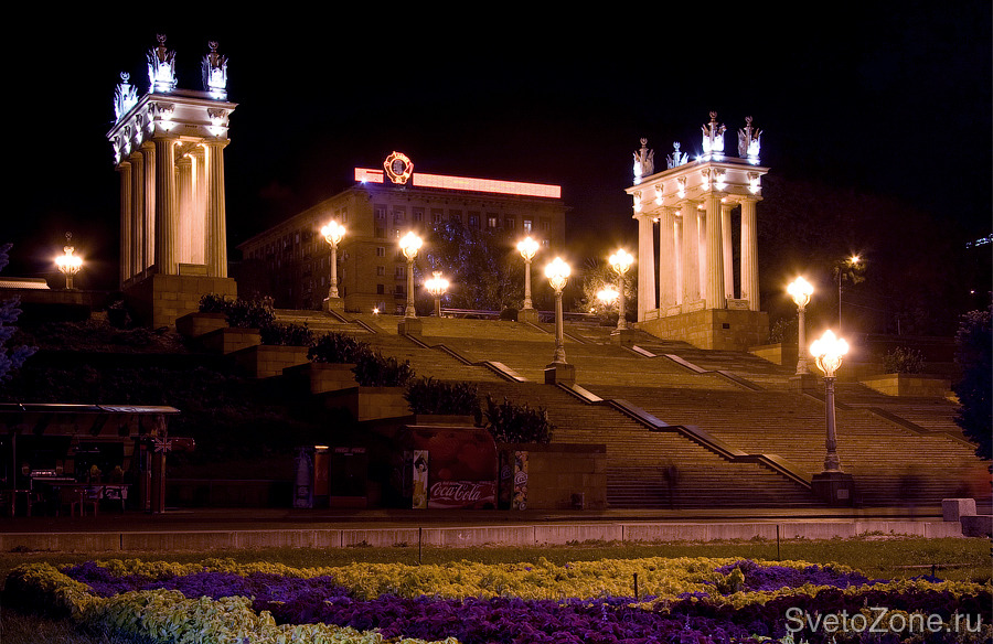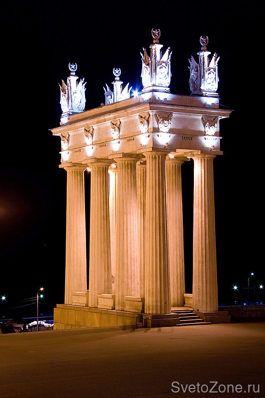 Пропилеи центральной набережной Волгограда – это главные архитектурные ворота города и один из его символов. Объект в стиле классического ампира изобилует деталями и символами, каждый из которых был выделен и подчеркнут с помощью подсветки.