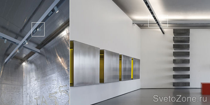 Специально для этого проекта Тадао Андо были спроектированы алюминиевые балки со встроенным в них светильниками. Балки крепятся вдоль стен, что позволяет не загораживать вид на уникальные потолки. Такая модульная система отличается гибкостью в применении, позволяет создать различные варианты освещения и способна в полной мере выявить красоту освещаемого пространства.