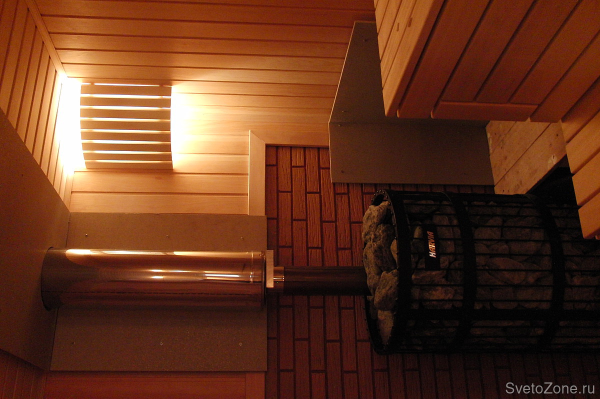 При освещении сауны использованы специализированные светильники фирмы Harvia. Абажуры по своей фактуре и цвету идеально сочетаются с использованной при отделке сауны вагонкой.