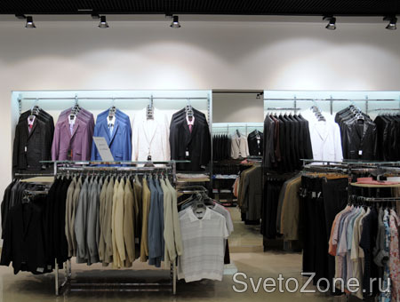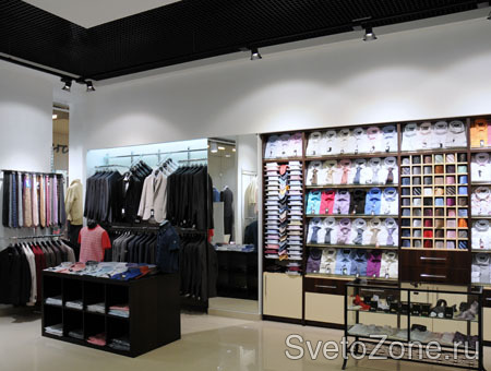 Наши специалисты смогли добиться высокой степени освещенности и цветопередачи на стеллажах и вешалах. Для этого по периметру магазина были установлены металлогалогенные прожекторы Action (Lival) на шинопроводе.