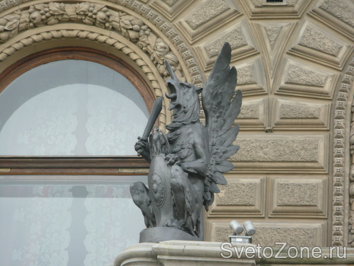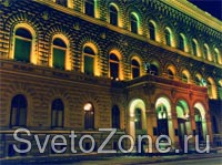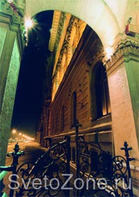 Главной световой (как и архитектурной) доминантой здания служит колоннада портика – внутри нее наблюдается максимальная концентрация света, подчеркивающая арки сводов, фонари и силуэты колонн. Сверху на балконе светильники подсвечивают фигуры грифонов.