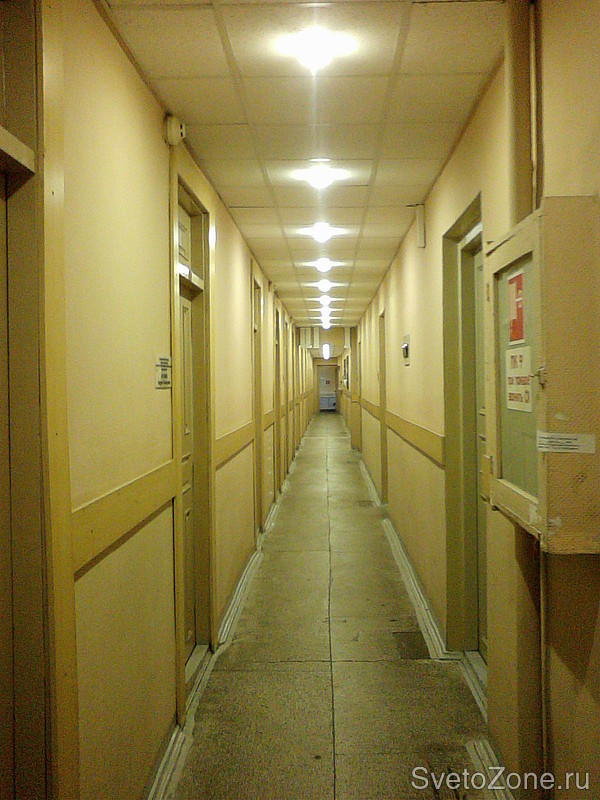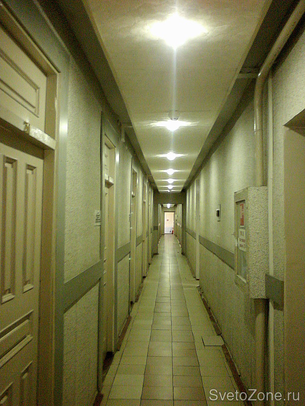 Для освещения коридоров применялись светодиодные светильники ЖКХ-08/100 с потреблением 10 Вт, при этом соблюдены нормы освещенности согласно действующим нормативам.