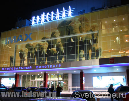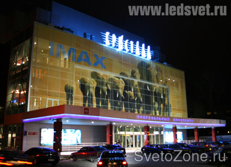 Компанией "Энерголюкс" официальным представителем Компании "ФОКУС" в Перми реализован проект по декоративному освещению фасада кинотеатра Кристалл-IMAX (совместный проект с Рекламно-производственной группой «Спектр»). Для реализации данного проекта использованы светодиодные светильники УСС-70/100, которые установлены на козырьке входа за парапетом и освещают главный фасад.