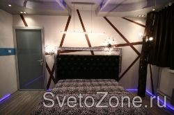 В необычной спальне интерьер должен отличаться изобилием конструкций из оргстекла, металла и гипсокартона.