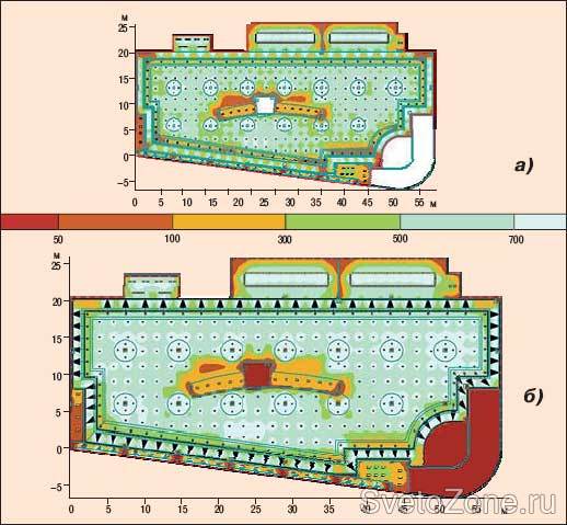 Основным светильником для общего освещения стала модель 74 серии (HALLA) с МГЛ типа CDM мощностью 70 Вт. Использовать светильники только с МГЛ было бы невыгодно, ввиду их дороговизны и вероятности образования дискомфорта - «слепящего эффекта», из-за более низкого потолка, по сравнению с первым этажом. Поэтому дополнительно была использована модель Hony (LIVAL) с компактной люминисцентной лампой (КЛЛ). В результате смешения световых потоков МГЛ и КЛЛ общее освещение получается мягким и комфортным. В наиболее сложной зоне освещения (лестничный проём между этажами) установили светильник 21 серии (HALLA) с двумя и четырьмя галогенными лампами накаливания (ГЛН) типа Halospot. Рефлекторная лампа с узким углом излучения (до 4°) дает идеально направленный пучок, способный обеспечить акцентирующее освещение объектов даже в хорошо освещённом помещении. По задумке дизайнеров второй этаж сделали похожим на первый, чтобы соблюсти единство стиля. Для этой цели построили радиальные конструкции на колоннах со встраиваемыми светильниками Super DL (LIVAL). Окончательный вариант ОУ и распределение освещенности по торговому залу второго этажа представлен на рисунке.