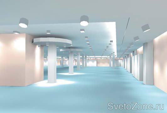 Первый этаж. Отечественные нормы для данных помещений регламентируют освещенность зала не менее 300 лк, при этом регламентируется и цилиндрическая освещенность не менее 100 лк. По зарубежным данным общая освещенность, равная 300 лк, не достаточна и должна быть увеличена в 1,5 – 2 раза.