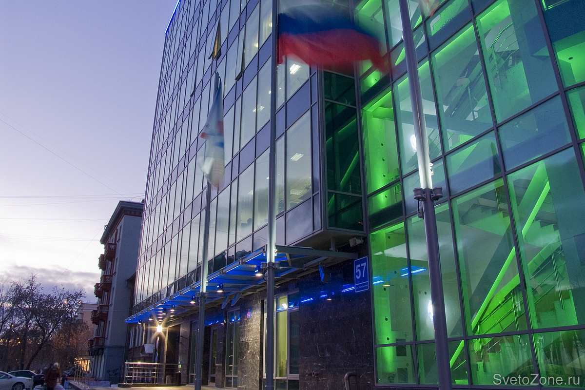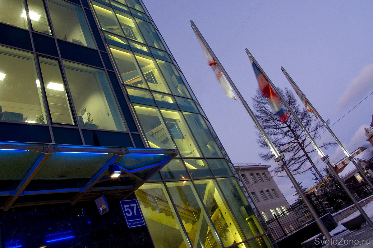 Проект включал в себя освещение входной зоны, выделение лестничной клетки за витражным остекление и подчёркивание верхней части здания. Так же в комплексе изготавливалась рекламная конструкция с названием организации.