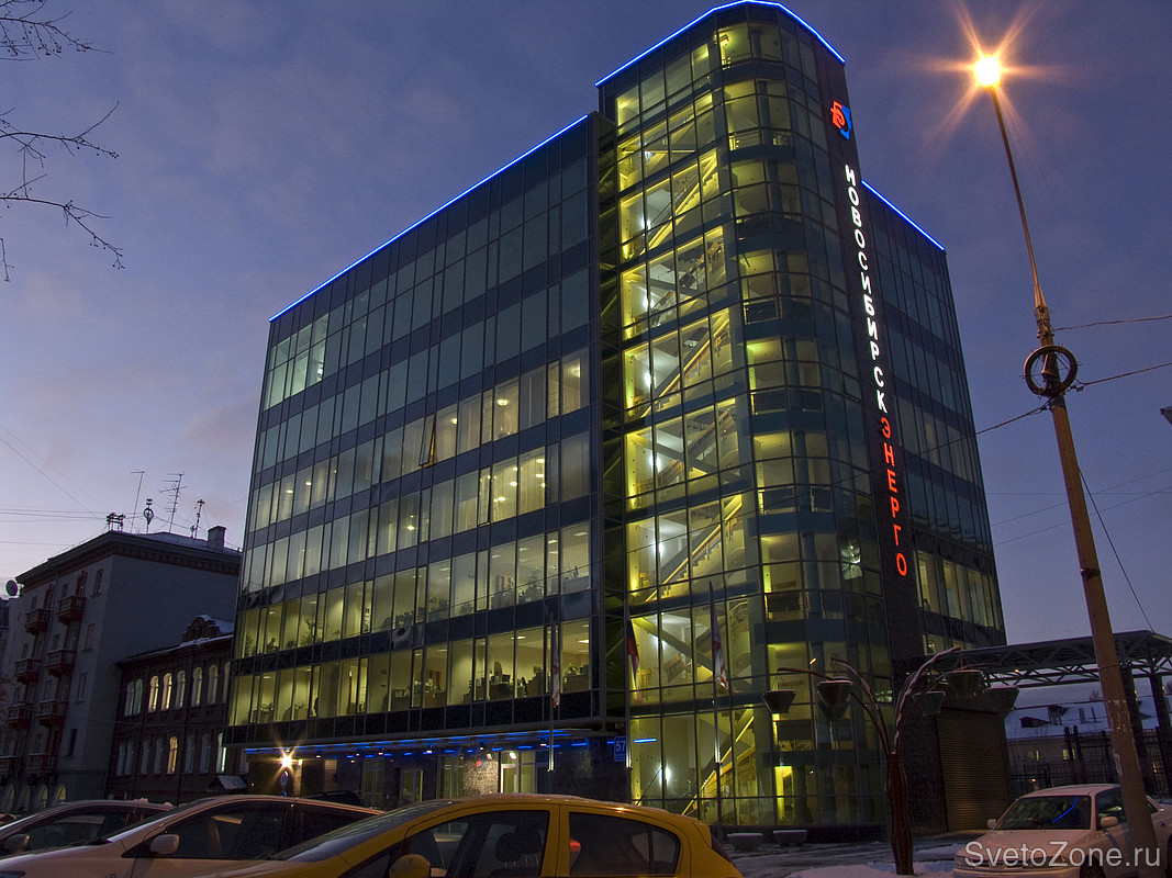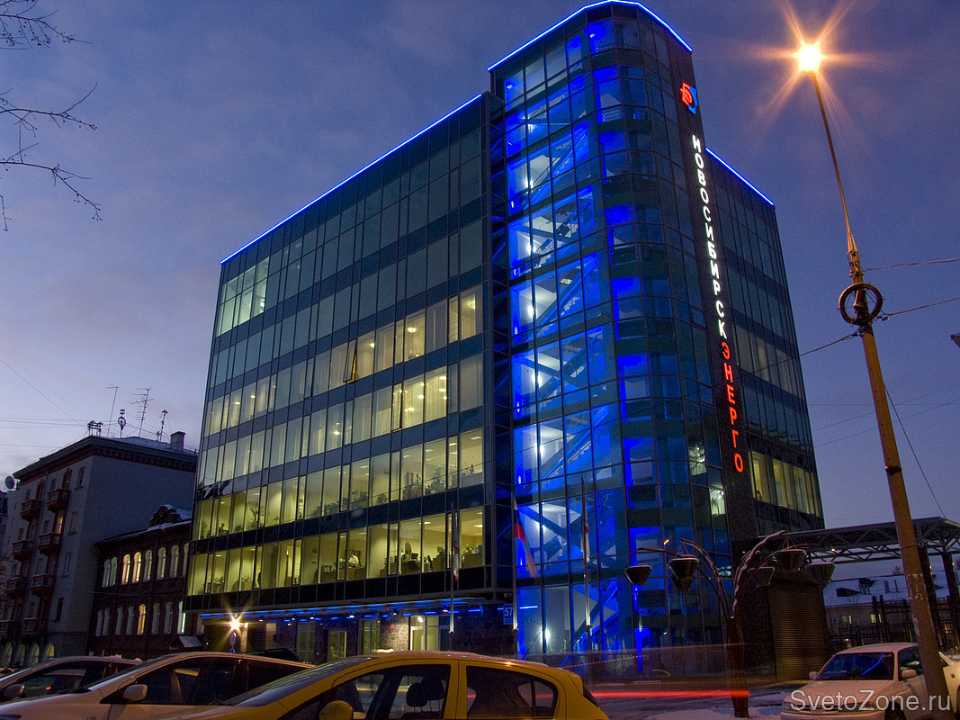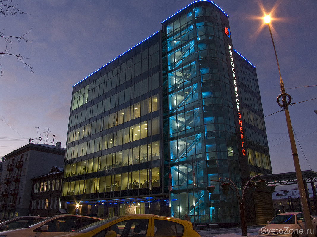 Лестничная клетка имеет два режима работы: будничный - синий цвет (фирменный цвет ОАО "Новосибирскэнерго"), и праздничный - цветосмешение.