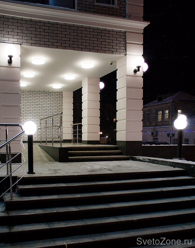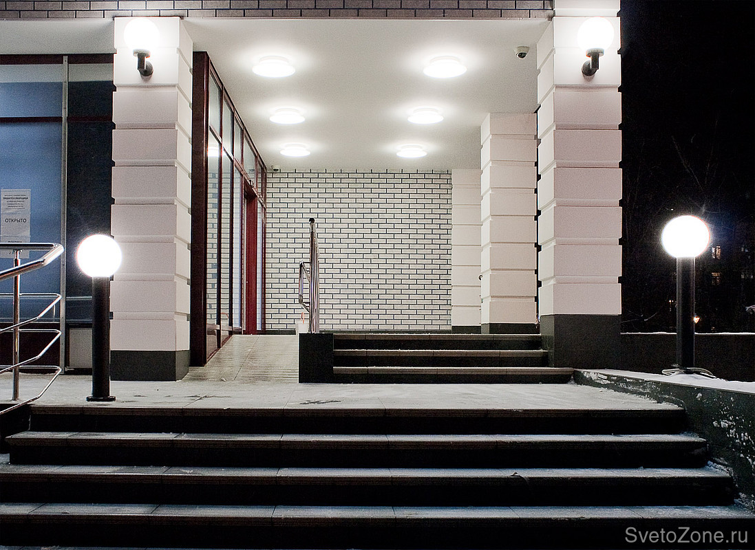 Ногинск – очень уютный небольшой город, центральная его часть освещена в одном стиле с использованием декоративных уличных фонарей – классических матовых шариков. Чтобы вписать наше здание в принятую в городе стилистику мы использовали настенные бра производства RZB (Германия) на первом этаже. Цветность всех источников света использовалась холодная, как в фонарях городского освещения. Вход в здание ярко освещен светильниками MONDANA (RZB) с компактными люминесцентными лампами.