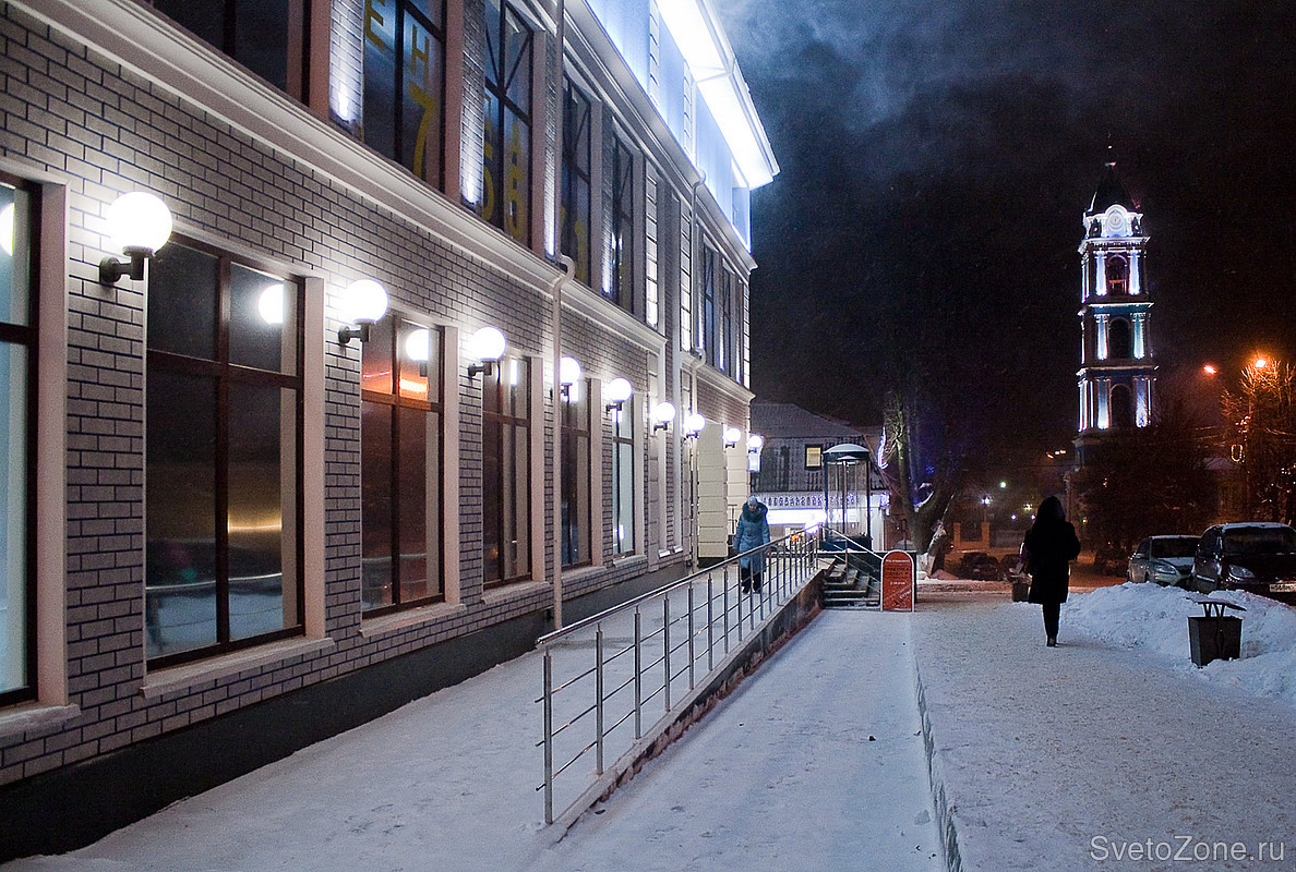 Здание в самом центре Ногинска предназначено для сдачи в аренду под офисы. Заказчиком была поставлена задача создания архитектурного освещения, которое бы выгодно выделяло здание на фоне окружающей застройки, но в тоже время сочеталось по стилю с городским освещением (стиль уличных фонарей, цветность источников света).