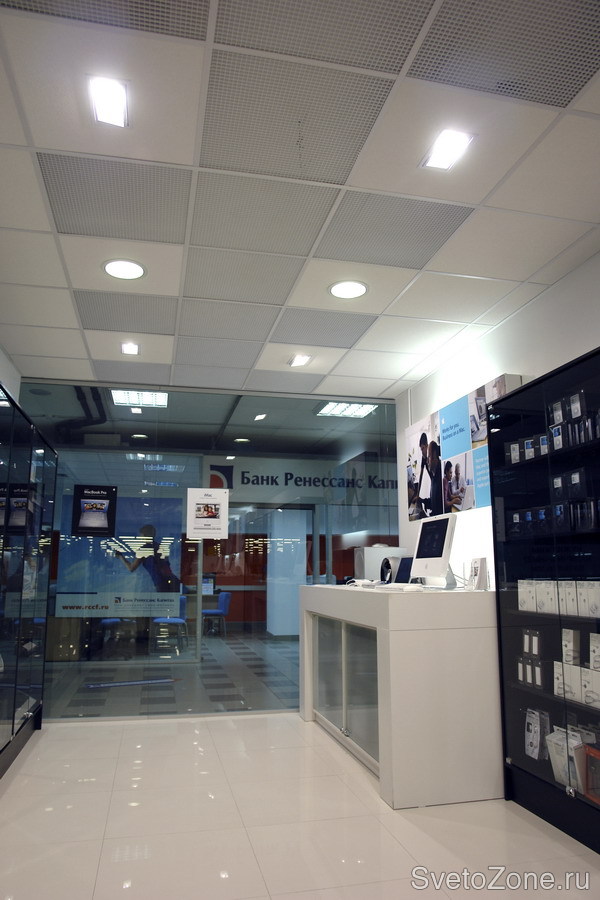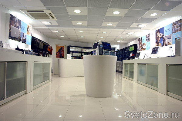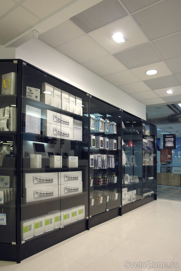 Размещение поворотных светильников, обеспечивающих акцентное освещение, по периметру торгового зала (вдоль торгового оборудования) полностью исключило с слепящий эффект. Высокотехнологичный дизайн продукции подчеркнули источники света нейтральной цветности.