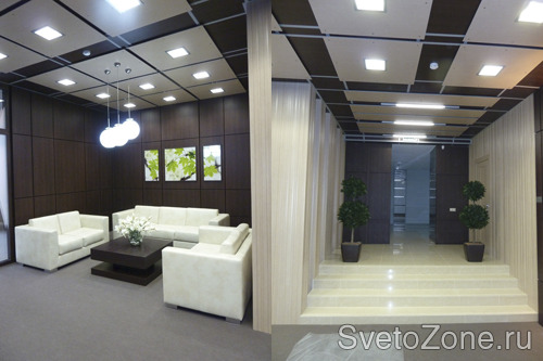 Офисные зоны и декоративные элементы холла выполнены на подвесных люминесцентных светильниках серии MX.