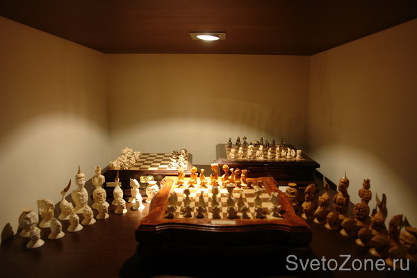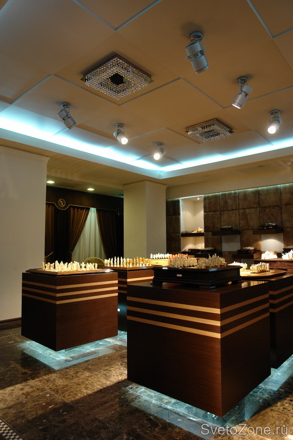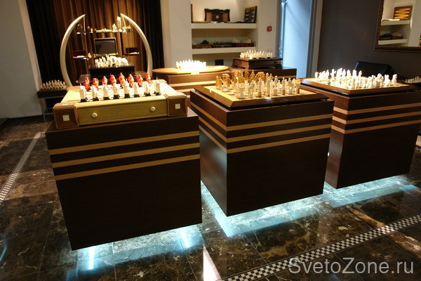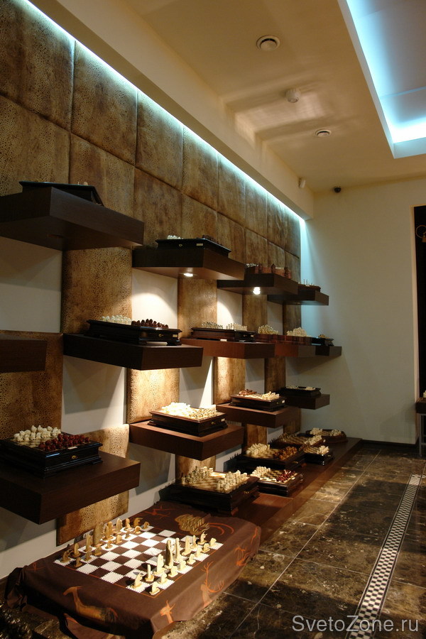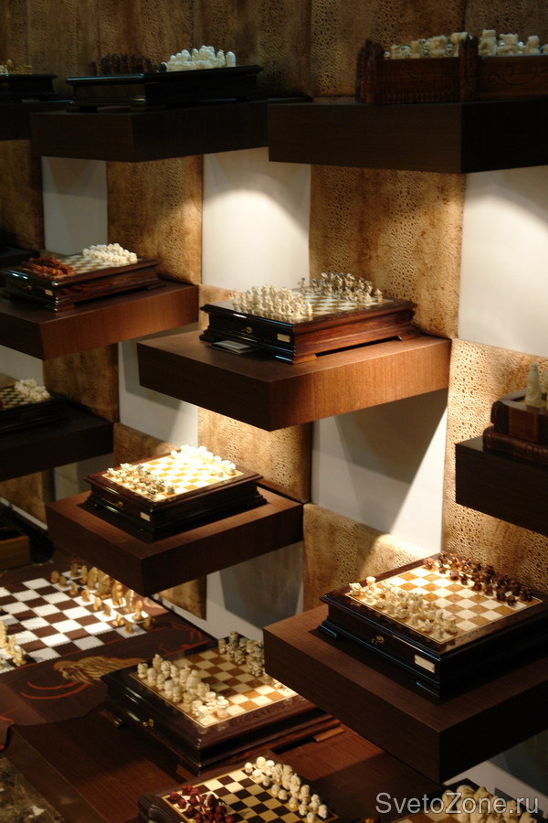 Для акцентной подсветки идеально подошли галогенные светильники Halogen MR 16/12, что позволило выгодно осветить шахматные доски и дать возможность покупателю рассмотреть индивидуальный образ каждой фигуры набора. При этом игра света сохранила таинственность фигур.